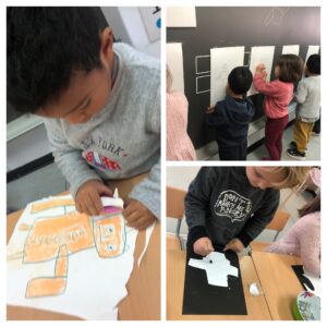 En aquesta sessió, que avui us mostrem amb imatges, podeu veure com els infants van dibuixar robots. Amb l’única consigna que el cos i el cap havien de ser quadrats. Una manera per avaluar si tot el treball realitzat havia estat interioritzat i quins calen seguir reforçant.