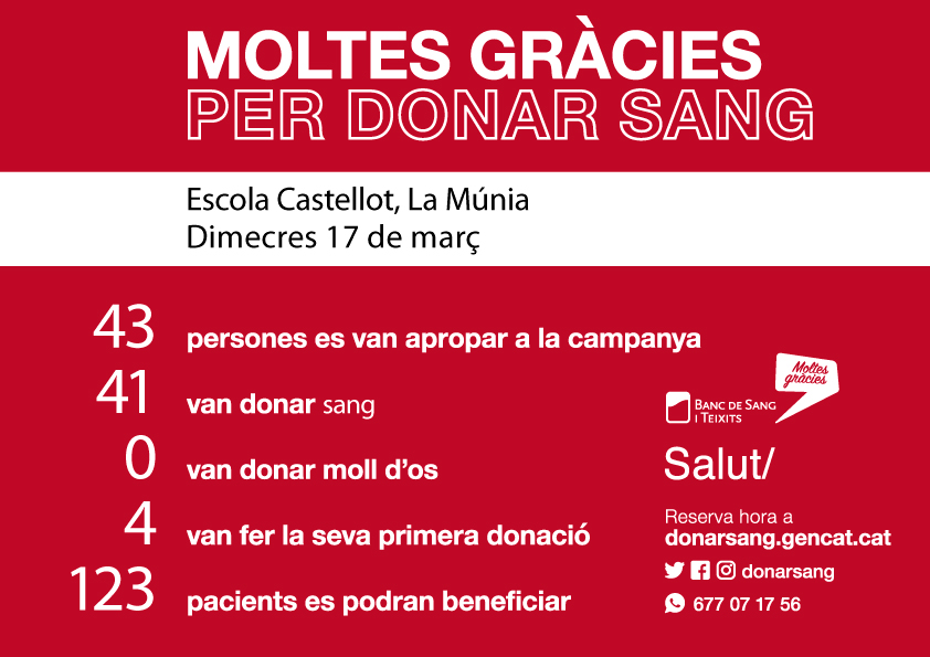 Estem molt contents dels resultats i volem donar les gràcies a tothom que ens ha ajudat a fer-ho possible. En primer lloc al Banc de Sang per confiar en nosaltres. En segon lloc als donants que van venir (alguns per primer cop). En tercer lloc als alumnes que hi han posat tot l’entusiasme i la dedicació necessàries. I, finalment, a les famílies del Cicle Superior que sempre -ja són set campanyes!- han recolzat aquest projecte d’aprenentatge-servei que ens permet aprendre moltes coses i, al mateix temps, donar un cop de mà a la comunitat.