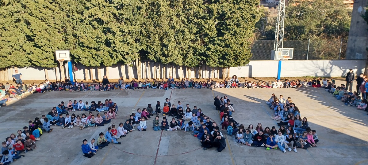 Com a tancament del dia, tota l’escola es va reunir a la pista per escriure conjuntament la paraula PAU, un gest simbòlic que va representar el compromís de tota la comunitat educativa per continuar construint un entorn basat en el respecte, la convivència i la solidaritat.