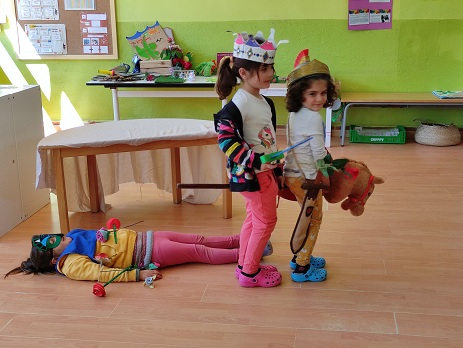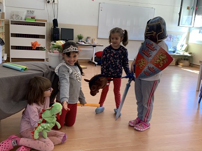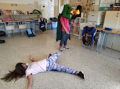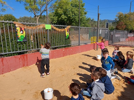 Els més petits de l’escola (P3 i P4) vam fer una gimcana pels patis on havien de fer curses de sacs, el joc de les cadires col·laboratiu, joc d’equilibris, de punteria per matar al drac amb xeringues d’aigua, de ganyotes…