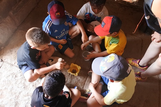 El sentit de l’olfacte es va explorar tot olorant diferents plantes aromàtiques, com la farigola i el romaní. Fins i tot van poder esmicolar la planta amb el morter per tal d’emportar-se una fragància natural per a la classe.