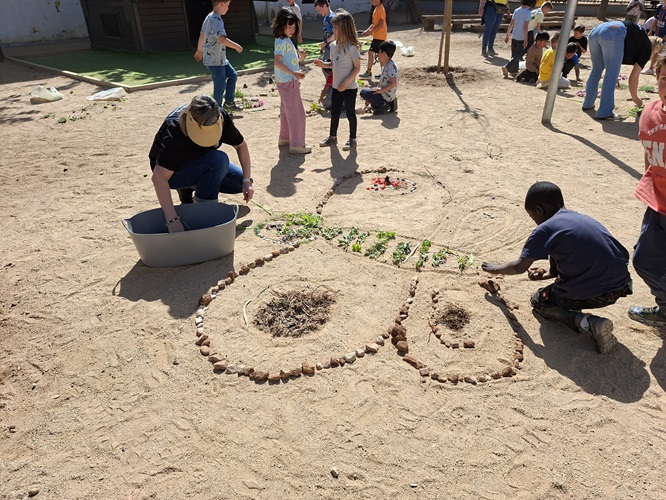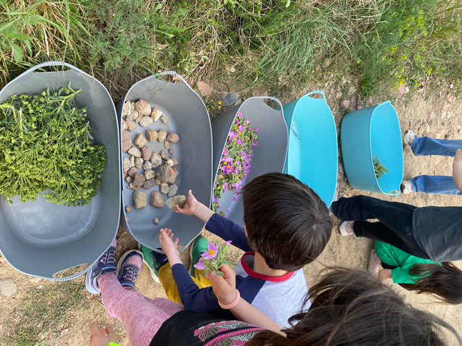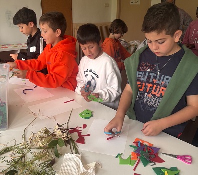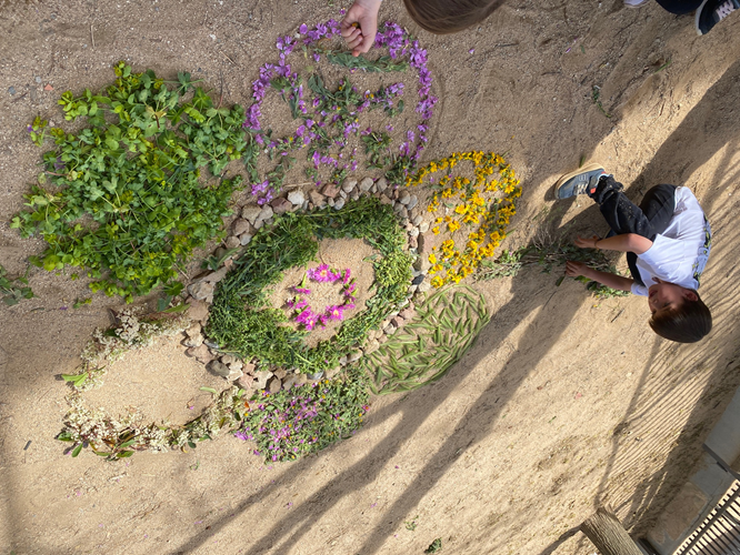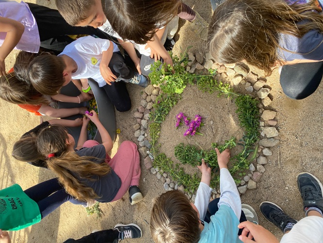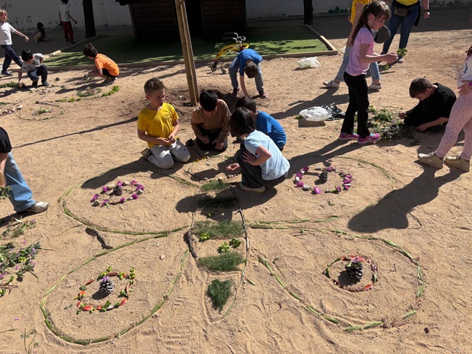 Els alumnes de 1r, 2n i 3r hem sortit al bosc, fora de l’escola, a buscar tota mena d’elements naturals (pals, pedres, flors, fulles, pinyes…) i amb tot el que hem recollit hem fet una creació col·laborativa d’unes papallones i una flor.