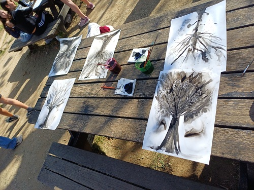 L’alumnat de 5è hem dibuixat els arbres del pati de l’escola. Ho hem fet amb una tècnica que consisteix a dibuixar amb un pinzell fi, mullar amb un spray d’aigua el dibuix i veure com la tinta queda difuminada. Ha estat molt divertit i sorprenent, l’aigua és difícil de dominar i no sempre hem aconseguit el resultat que esperàvem.
