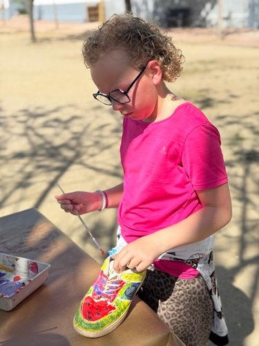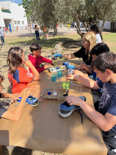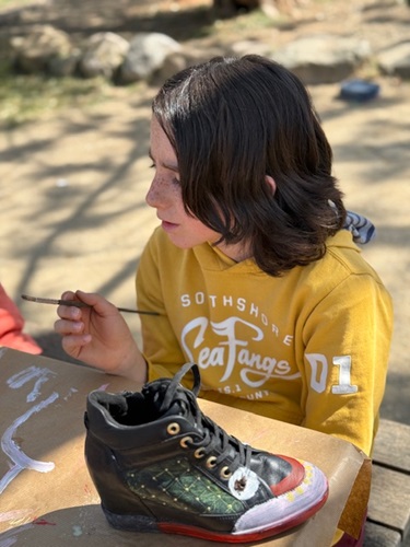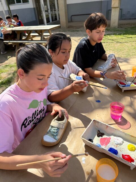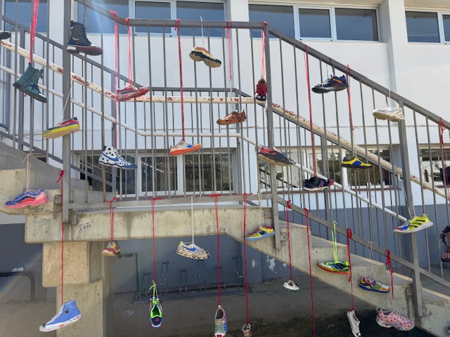 Els alumnes de 6è hem transformat sabates i vambes velles en petites obres d’art. Més que pintar el calçat, el repte consistia a crear un disseny original i creatiu sobre cada peça. Per acabar, hem exposat totes les creacions a la barana de les escales de 2n, formant una composició col·lectiva entre tots.