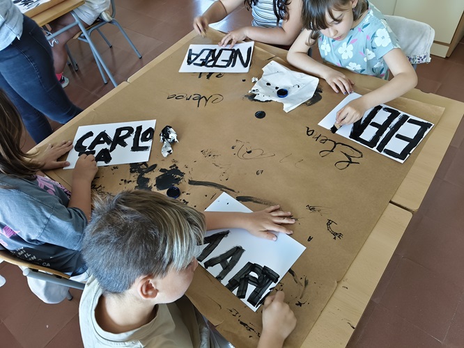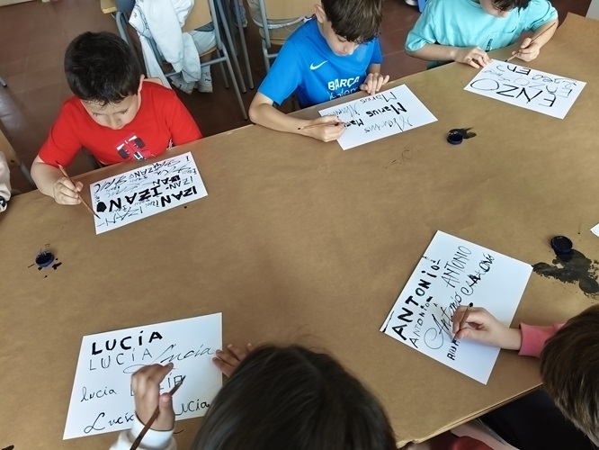 L’alumnat de 3r, utilitzant branques fines d’arbres i tinta xinesa, han escrit el seu nom explorant diferents tipus de lletres, tot jugant amb traços gruixuts i prims.