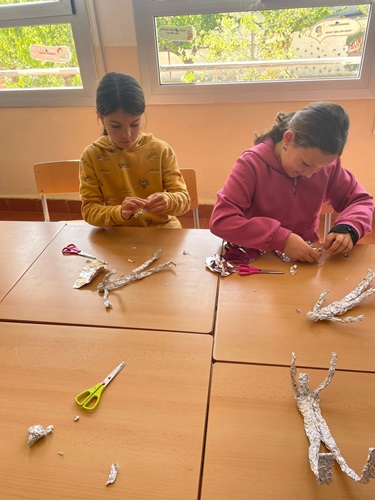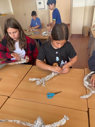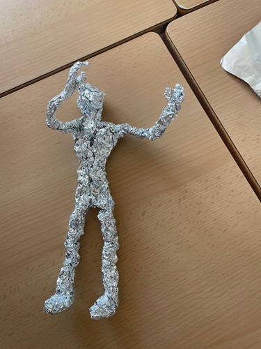 Els alumnes de 4t han utilitzat el paper d’alumini per treballar el volum, modelant figures humanes que han personalitzat amb instruments i posicions plenes d’energia. Una mostra que amb material reciclat es poden crear escultures d’allò més creatives