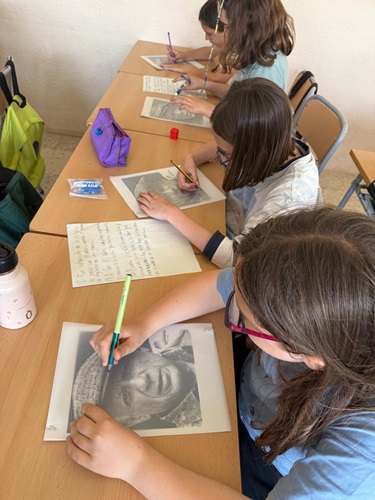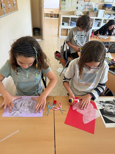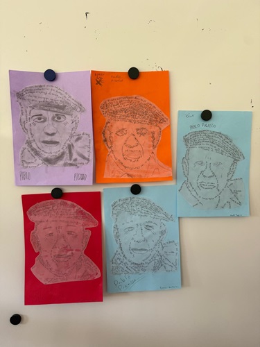 A 5è hem après sobre Pablo Picasso combinant treball en equip i art. Per parelles, mentre un membre memoritzava informació pel passadís, l’altre la transcrivia a l’aula. Amb aquestes dades, hem creat uns cal·ligrames sobre fulls transparents, resseguint la silueta del pintor i afegint-hi detalls personals. Finalment, hem enganxat els retrats sobre fons de colors vius, creant una galeria d’allò més original.