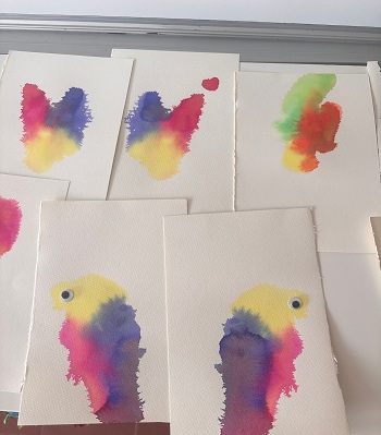 Els alumnes de 4t hem creat unes figures fantàstiques treballant en parelles i experimentant amb la taca i l’atzar. Hem col·locat gotes d’aigua i tinta líquida sobre papers d’aquarel·la per després estampar-los entre si, creant formes simètriques sorprenents que ens han servit de base per imaginar i donar vida a diferents animals afegint-hi un ull de plàstic.