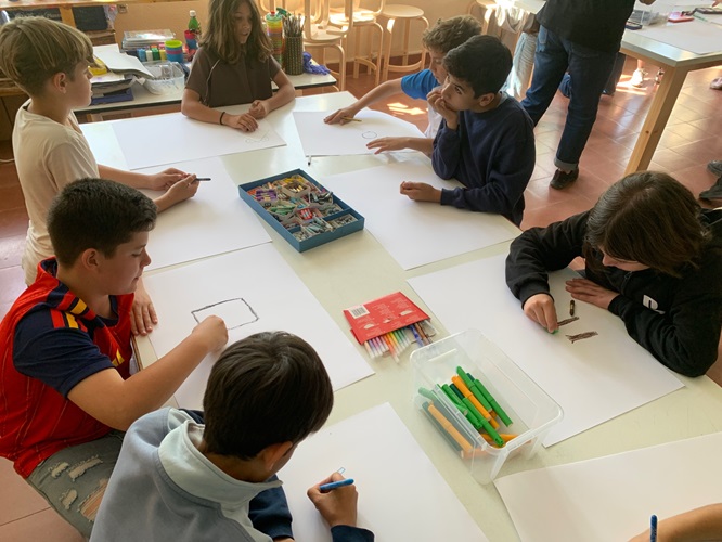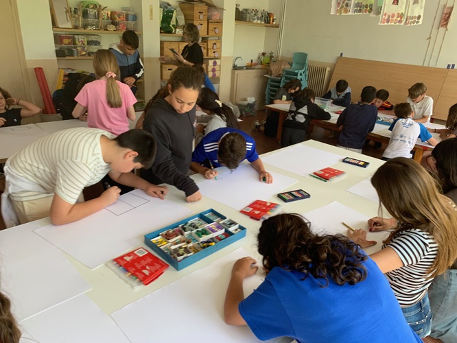 L’alumnat de 6è hem realitzat una creació col·laborativa molt dinàmica. Cada alumne començava un dibuix que, cada dos minuts i mig, passava a un company perquè el continués; un procés que hem repetit fins a vuit vegades. Finalment, cadascú ha recuperat la seva làmina original per donar-li els últims retocs i acabar l’obra.