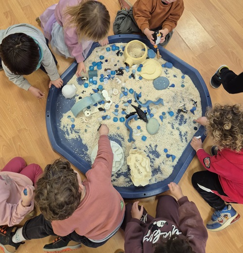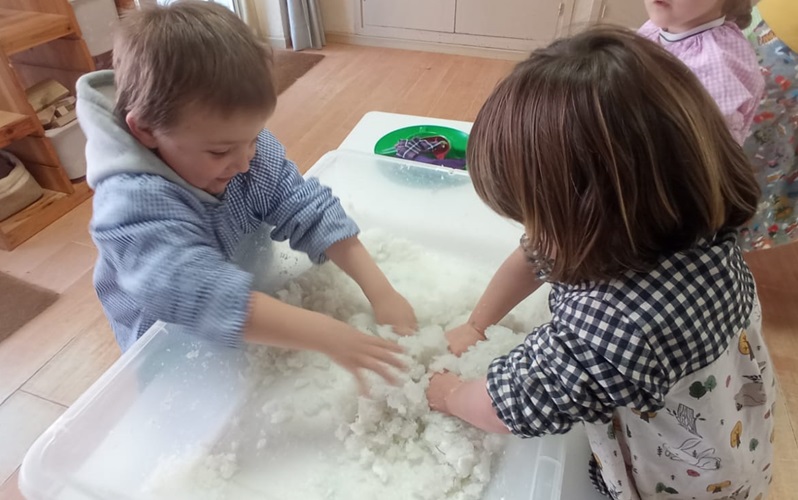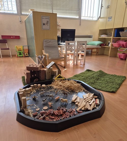 Vam fer joc simbòlic en gran format (metges, cuineta, botiga…) i en petit format (casetes, hivern, conte dels Tres Porquets…)