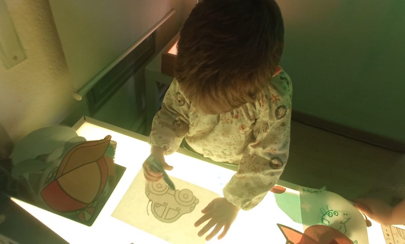 Vam jugar a fer neu amb el material que hi ha dins dels bolquers, a buscar les lletres de pasta del nostre nom, a calcar dibuixos amb les taules de llum…