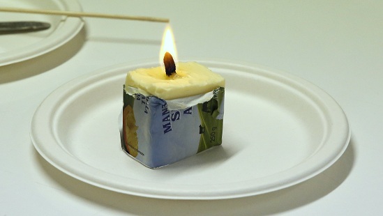 - Espelma casolana: Vam treballar la combustió de materials que trobem a casa, com la mantega i el paper de cuina, per construir una espelma casolana.