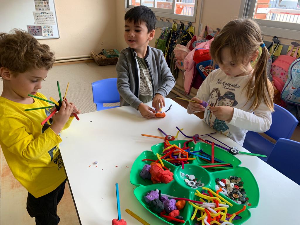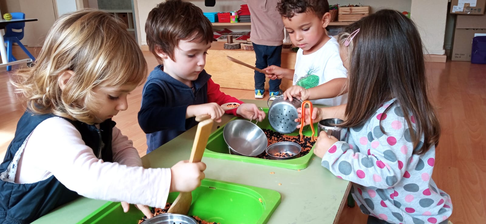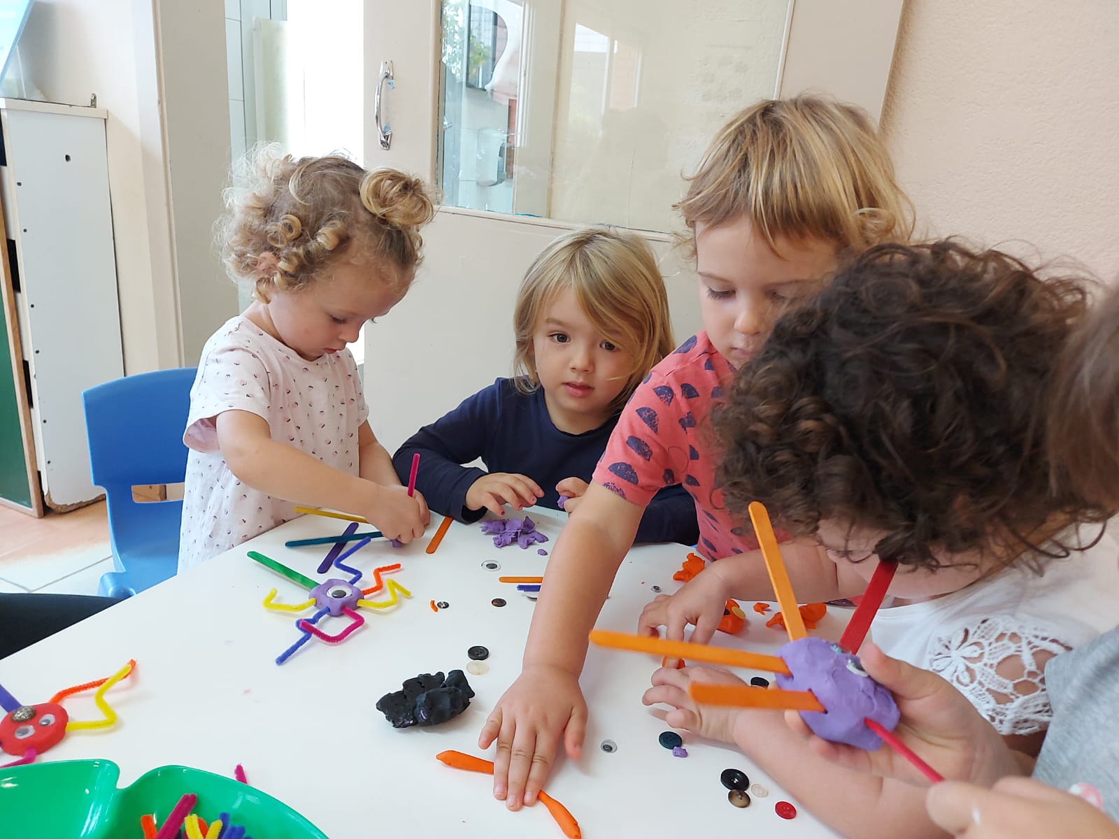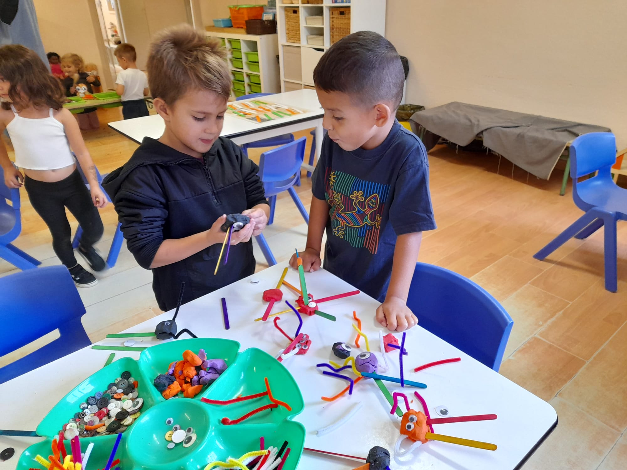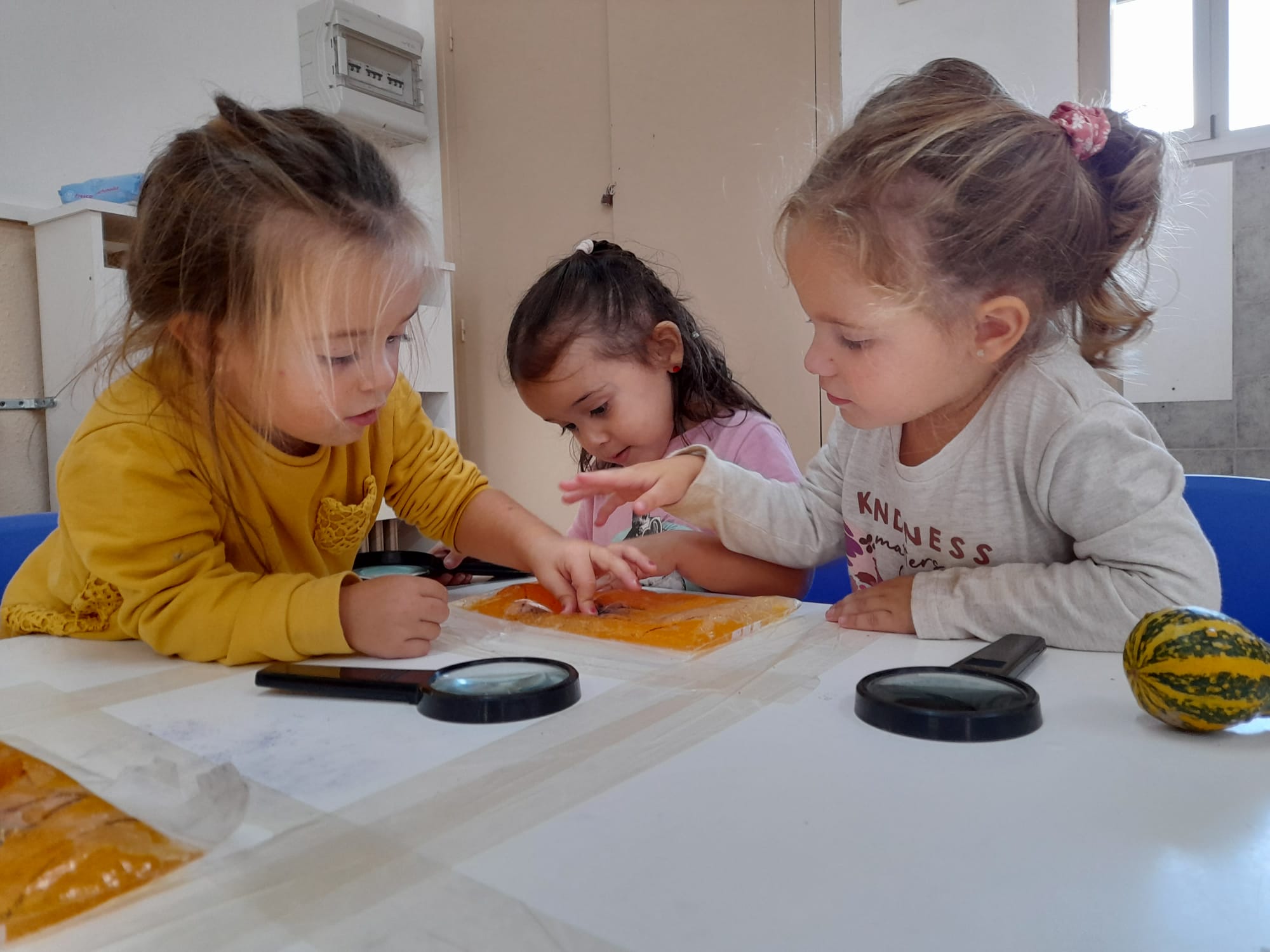 Després hem elaborat una manualitat en un pal de fusta (bruixa, mòmia, fantasma, monstre o carabassa) i ens ho hem passat pipa jugant i experimentant amb unes provocacions: fer monstres amb diferent material, observar carabasses amb una lupa, jugar amb les fustes i els personatges de la casa encantada, experimentar amb una bossa sensorial i per últim, jugar amb llavors i animals amagats.