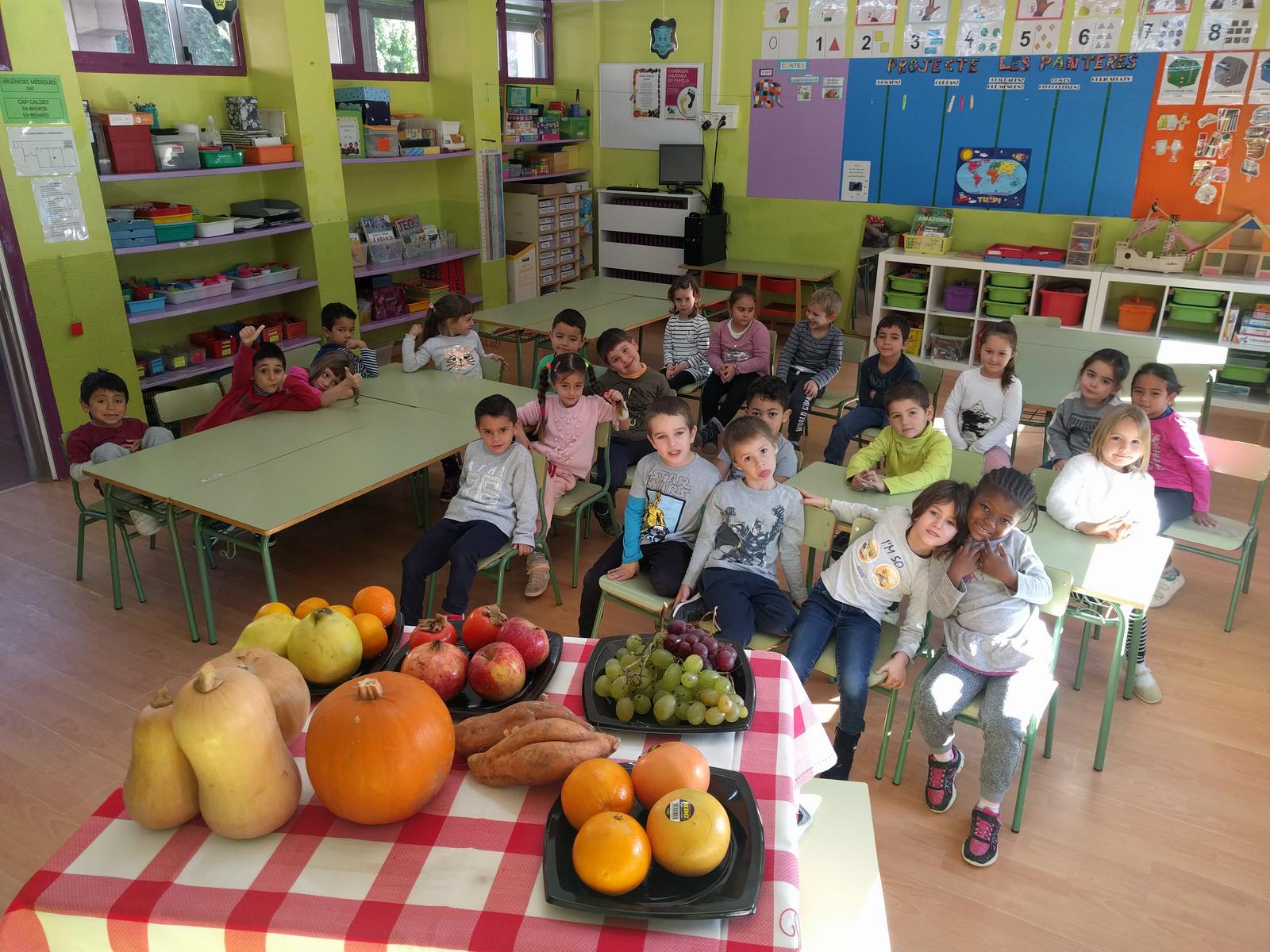 Cada infant va portar uns fruits a l’escola: ametlles, nous, avellanes, codonys, magranes, pomes, moniatos, raïm blanc i raïm negre, mandarines, taronges… que vam agrupar i classificar a la classe. Després vam jugar a pesar-los: