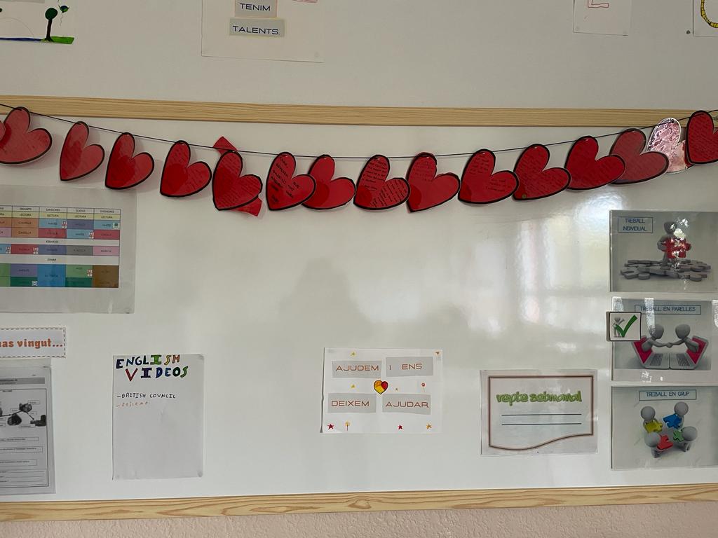 En el cas de tercer, els missatges estaven escrits a dins de cors vermells que estaven penjats per tota la classe. Les seves cares han estat de sorpresa en veure tants cors. Ells i elles havien d’esbrinar quin era el seu. Al davant només es llegia l’escrit, al darrere estava el nom a l’infant que estava dirigit. Si ho esbrinaven l’agafaven i si no el tornaven a penjar. Gairebé tothom va esbrinar el seu! La part més bonica ha estat quan ells i elles han decidit tornar els missatges amorosos a les seves famílies. Ha estat una dinàmica feta des del cor!