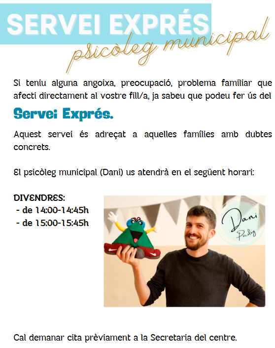 Atenció psicopedagògica L’horari d’atenció per al nostre alumnat és: EAP: cada dimarts i el segon dimecres de cada mes de 9 a 14h. Psicòleg municipal: dies determinats en horari lectiu mentre els alumnes són a l’escola. L’horari d’atenció per les famílies és: