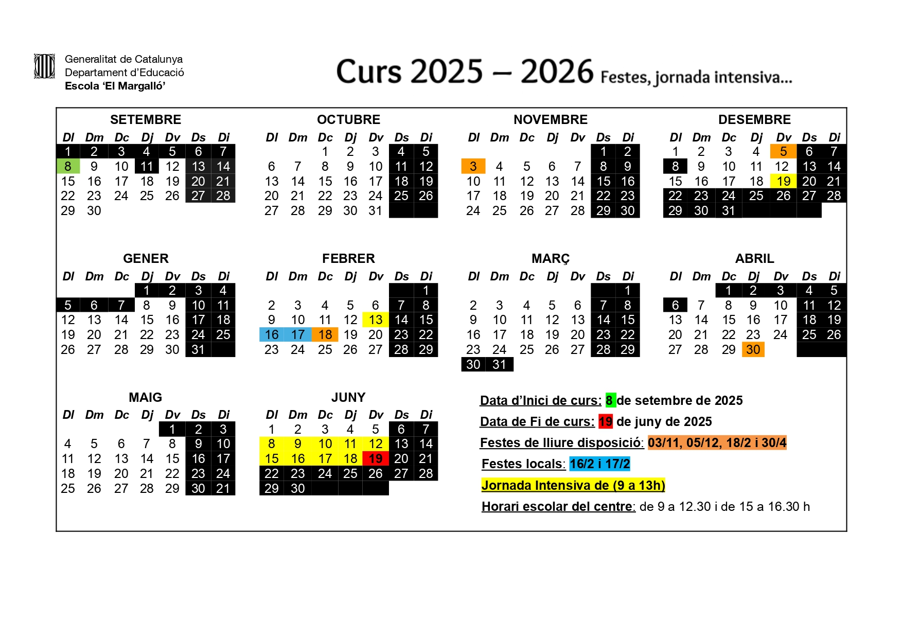 L’horari lectiu del centre és de 9 a 12,30 h i de 15,00 a 16,30 h per a tots els alumnes del centre. El dia 19 de desembre de 2025 i a partir del 8 de juny de 2026 es realitza horari compactat de 9 a 13h.