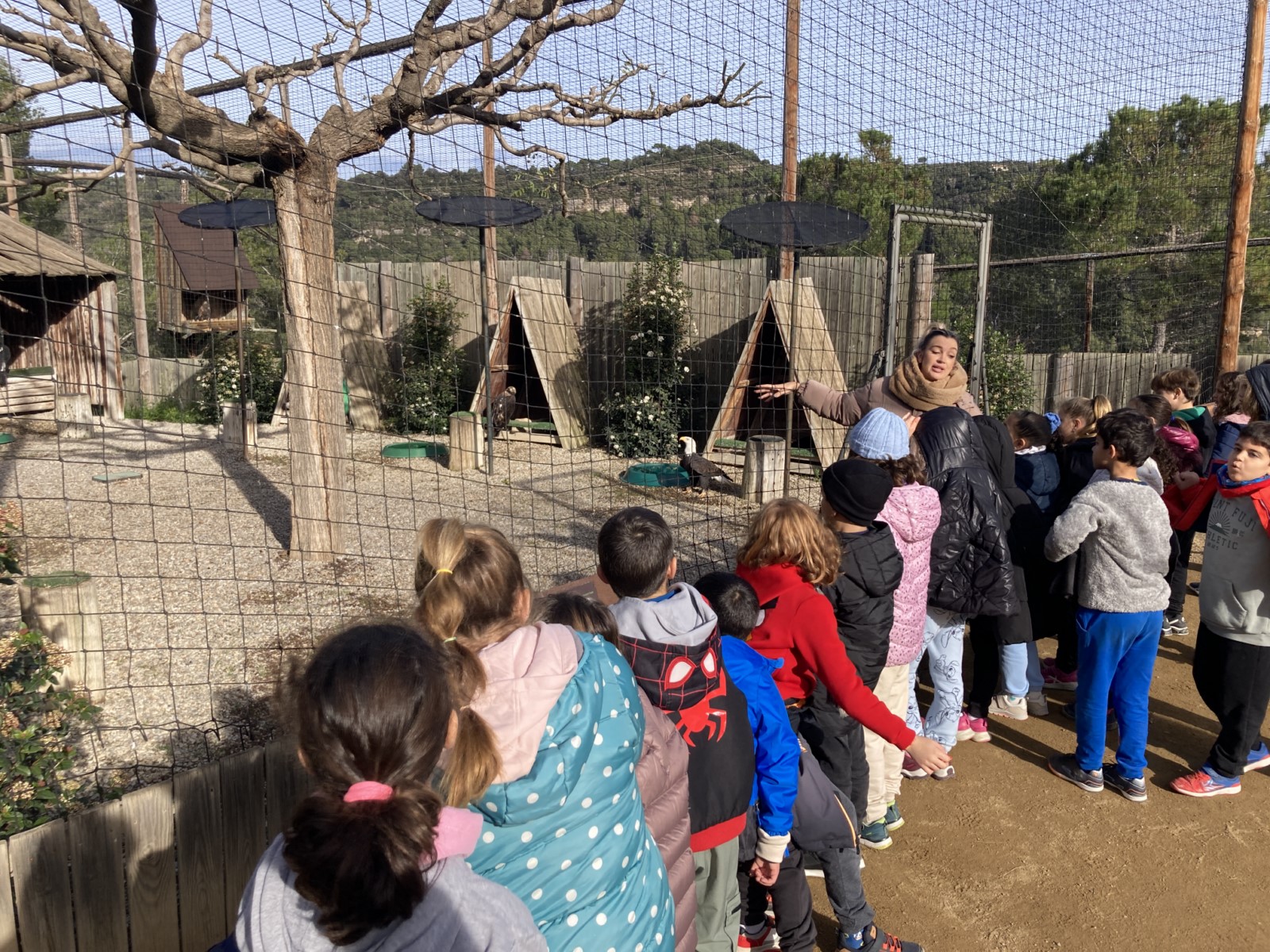 Seguidament, vam fer una visita a la zona de les aus on ens van explicar les característiques pròpies de les aus rapinyaires. Es poden observar de ben a prop, aproximadament 25 espècies: mussol, duc, òliba, falcó, àguila, aligot, milà…
