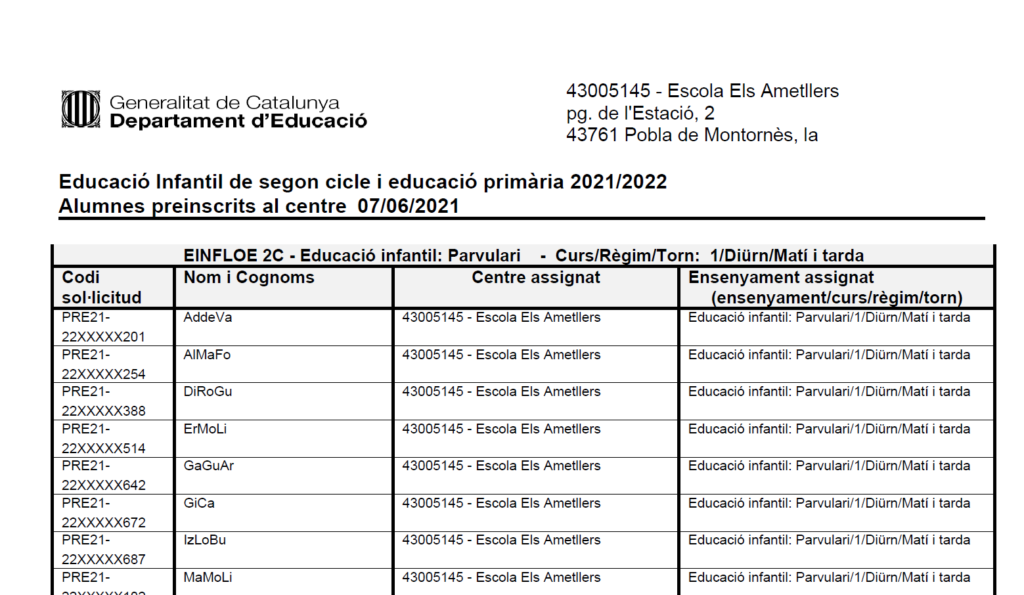Llista d’assignació de places i llista d’espera admin07/06/21 Ja podeu consultar el llistat d’Assignació de places i també el llistat d’espera publicat pel Departament d’Educació.