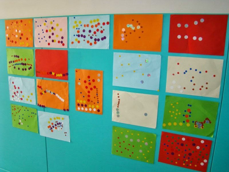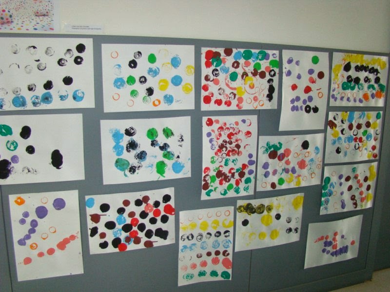 Vam treballar els cercles de colors sobre blanc estampant taps d’ampolla amb pintura.