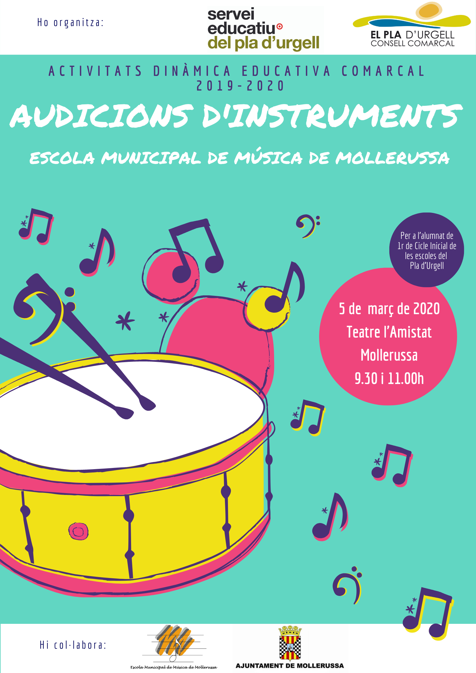 Aquest mati, els alumnes de 1r hem anat al Teatre L’Amistat on hem pogut gaudir de les audicions musicals que ens han mostrat els alumnes de l’escola de música de Mollerussa. Concretament l’orquestra infantil.