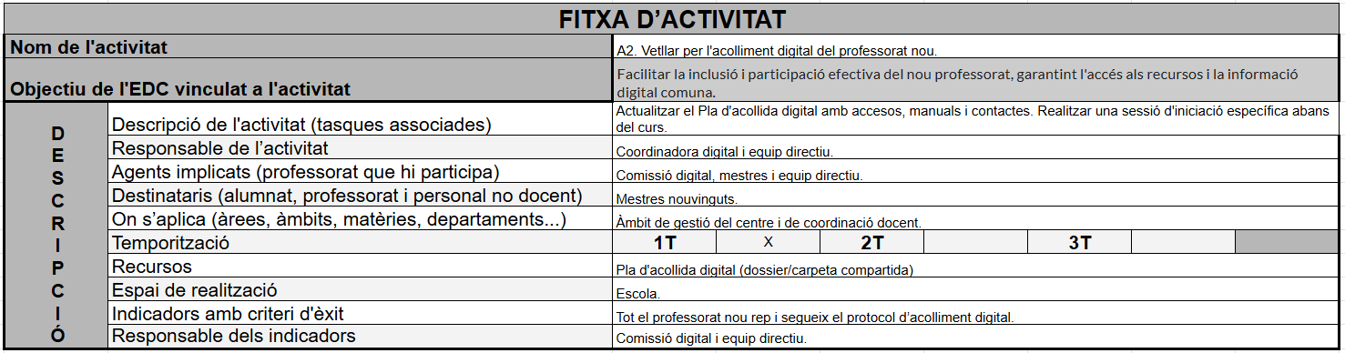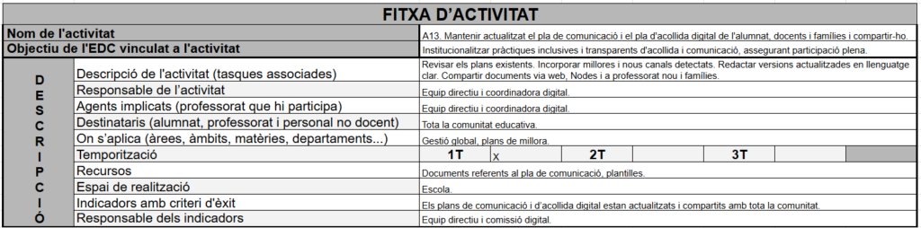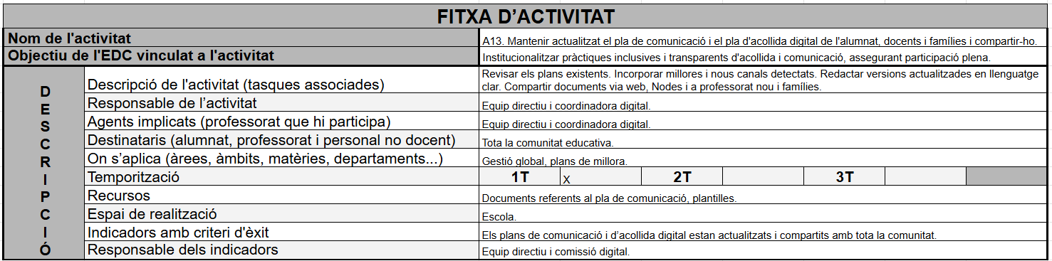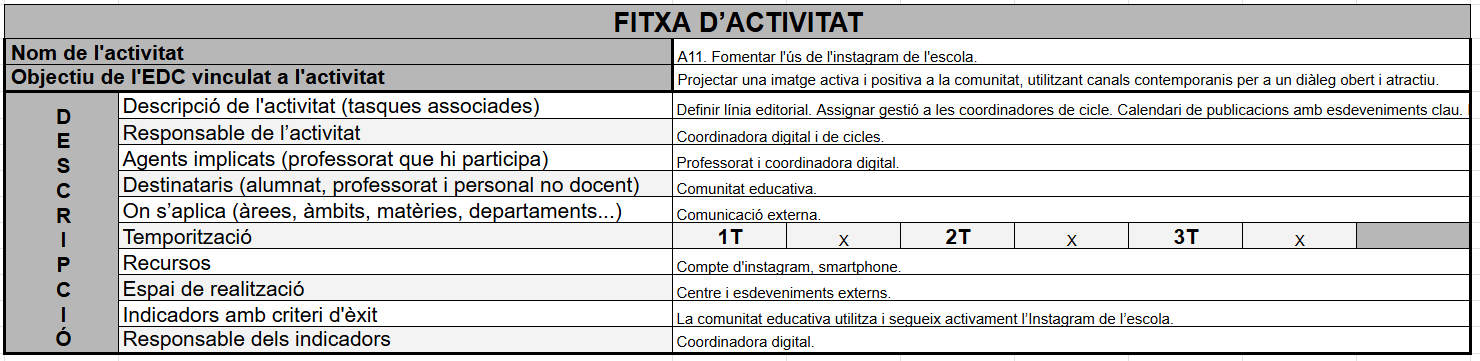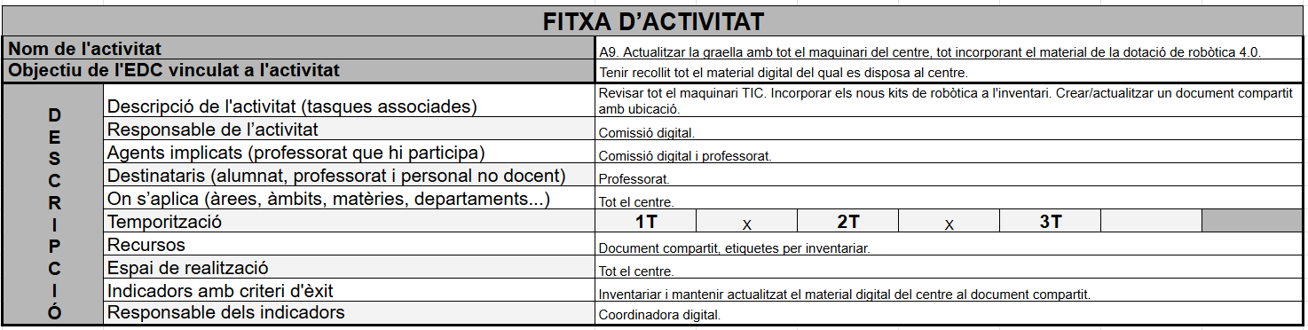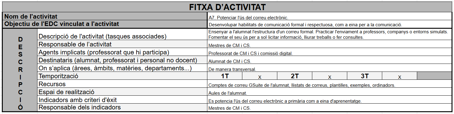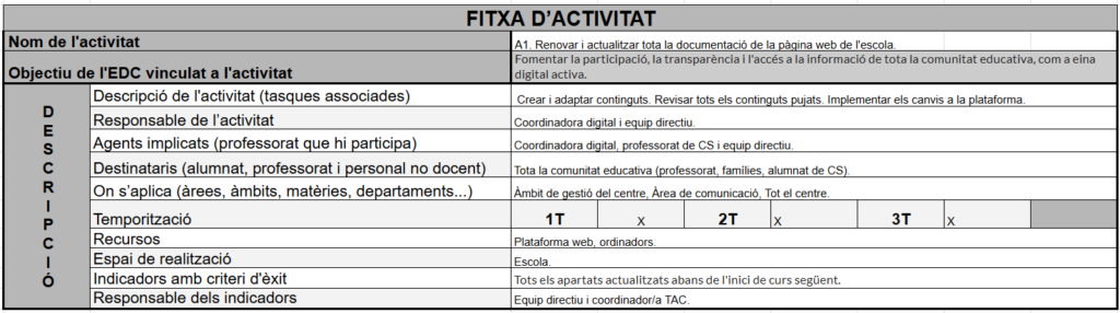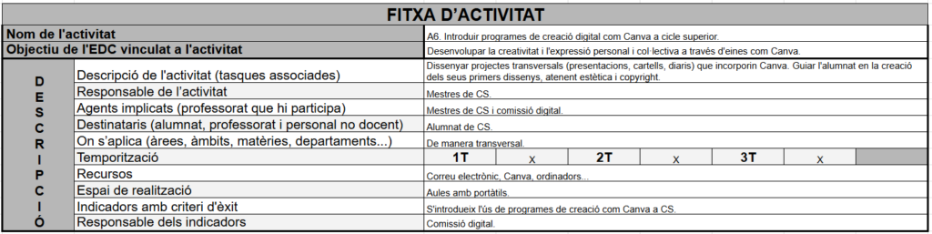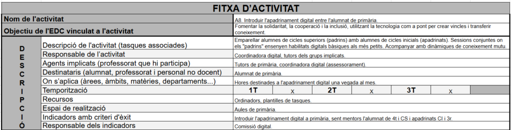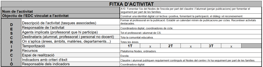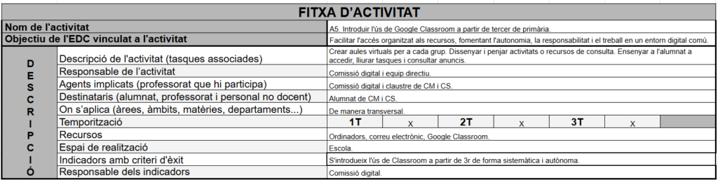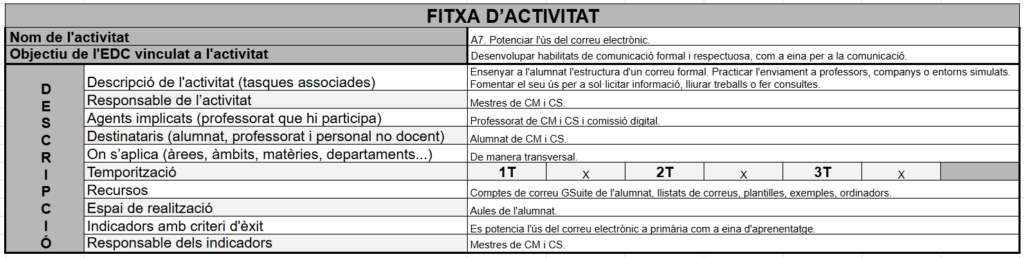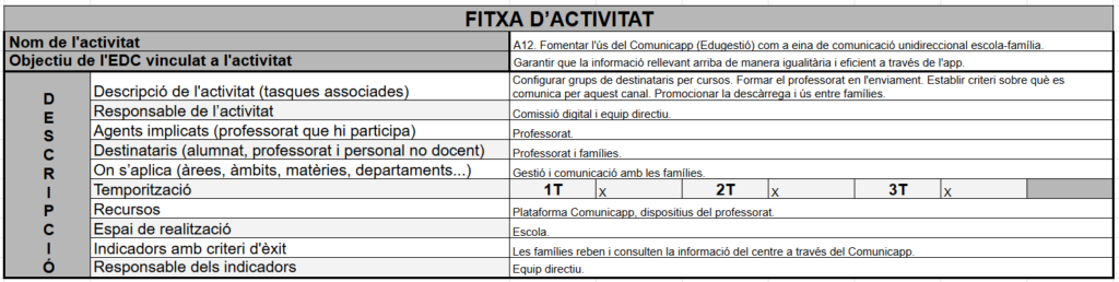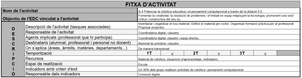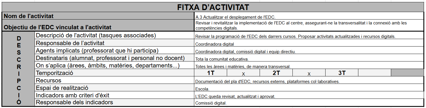 Els objectius surten a partir de tots els resultats obtinguts en la diagnosi de centre. A continuació es pot veure la graella amb els objectius de l’EDC que s’han programat durant quatre cursos: