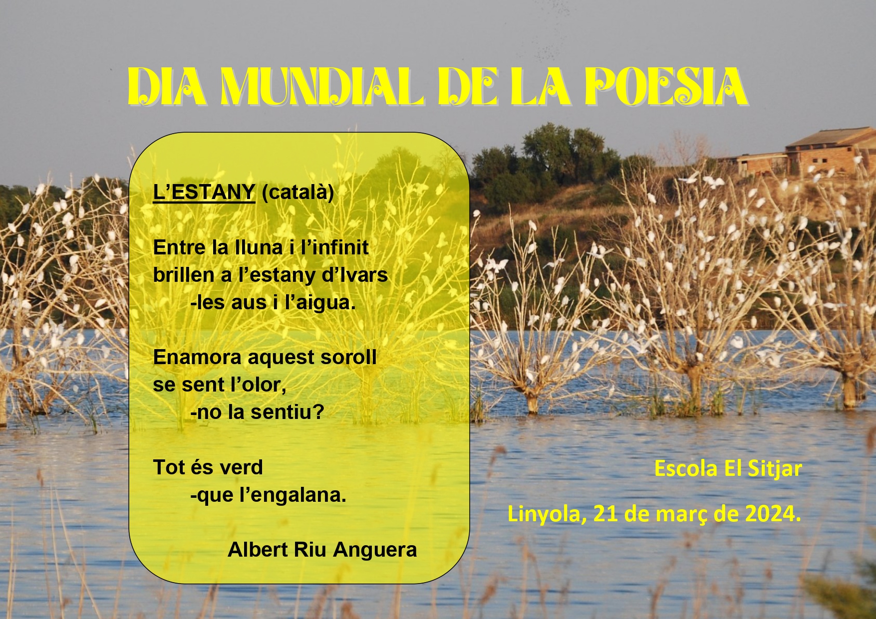 Cada 21 de març es celebra el Dia Mundial de la Poesia i de la Síndrome de Down. Enguany hem escollit un poema, L’estany, d’Albert Riu Anguera, veí d’Ivars d’Urgell i amb Síndrome de Down. Aquest poema de l’Albert s’ha pogut traduir a diferents llengües gràcies a la participació de la comunitat educativa. Hem tingut la sort que l’autor de la poesia ha pogut venir a l’escola, acompanyat pel músic i compositor David Pradas, i ha pogut escoltar i gaudir de la lectura del seu poema en diferents llengües. Dues alumnes de 6è també han llegit el manifest de la Síndrome de Down, compartit amablement per l’Associació Down Lleida.