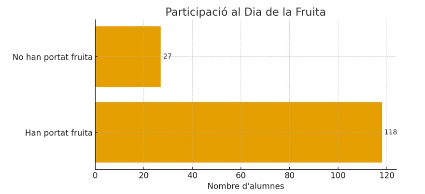 Aquest matí a l’escola hem reprès, com el curs passat, el Dia de la Fruita, una iniciativa que fomenta els hàbits saludables entre el nostre alumnat. Estem molt contents perquè 118 alumnes de primària, d’un total de 145, han portat fruita per esmorzar, mostrant així la seva implicació i conscienciació sobre la importància de menjar sa.