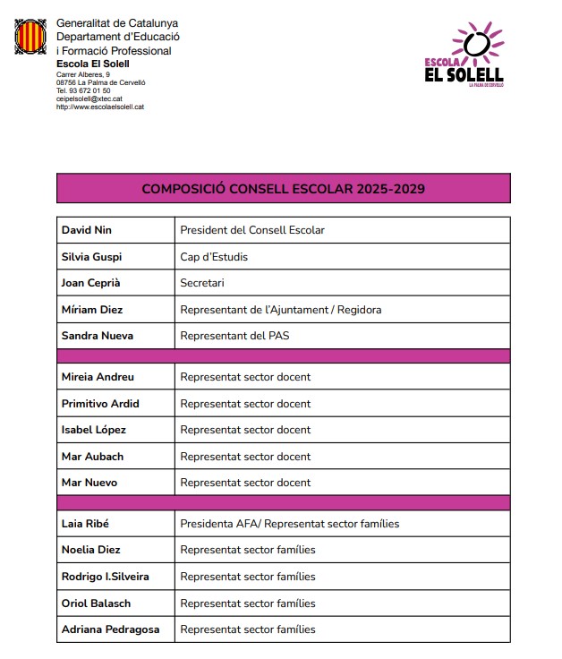 Composició Consell Escolar 2025 – 2029 Feu un comentari / Per admin / 25 de novembre de 2025 / Escola Organització i funcionament Portada Després de les eleccions al Consell Escolar que es van celebrar el passat 20 de novembre del 2025 la composició definitiva és la següent: