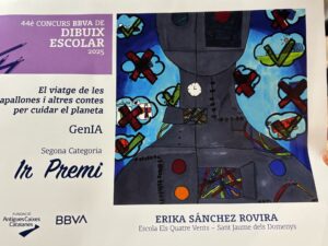 Aquest curs l’alumna Èrika Sánchez Rovira de 6è ha guanyat el 1r premi de Catalunya de la seva categoria. Aquest dissabte va assistir a l’acte de lliurament de premis a Terrassa acompanyada de la seva família i l’equip directiu de l’escola. Va rebre un diploma, el llibre on s’ha publicat el seu dibuix i una caixa plena d’estris per continuar desenvolupant la creativitat artística. Moltes felicitats ÈRIKA!!