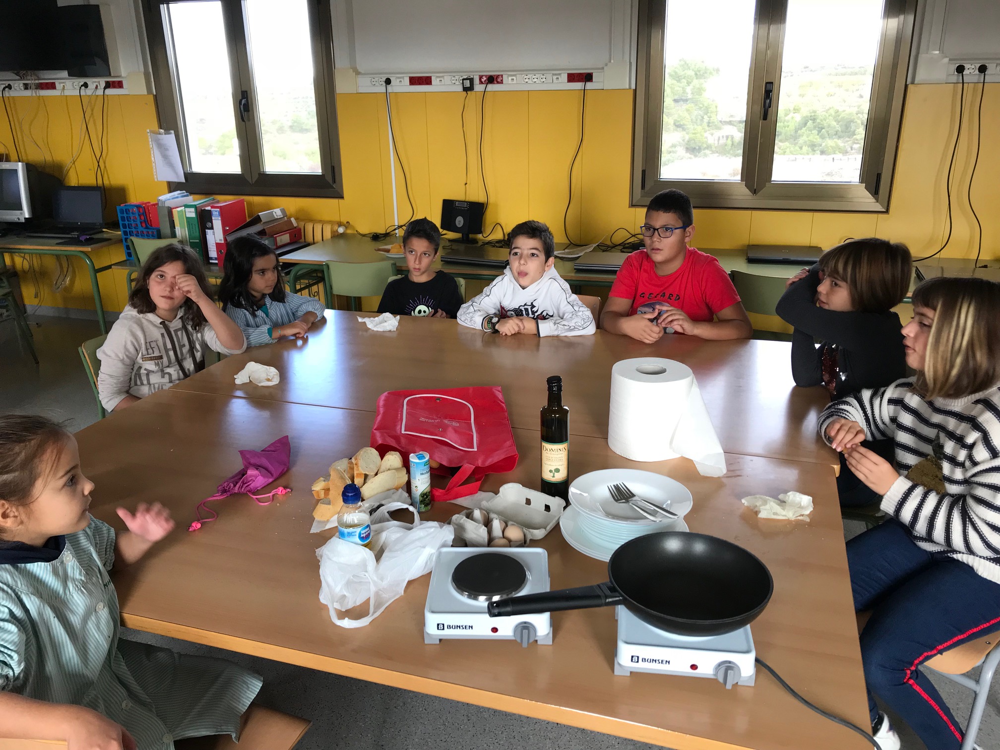 A l’hora del pati, entre tots hem fet tres truites: una d’un ou i dues de dos ous. Hem trencat i batut els ous i els hem cuit en uns petits fogonets de l’aula de ciències.