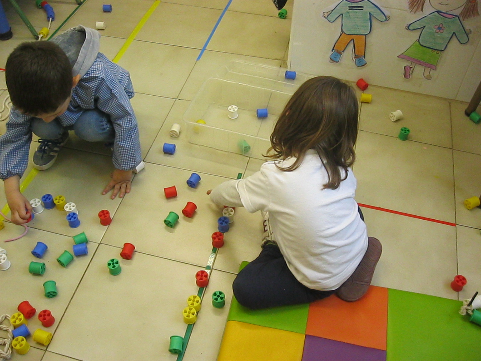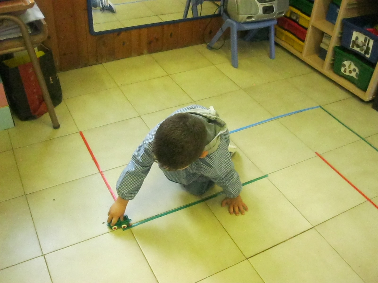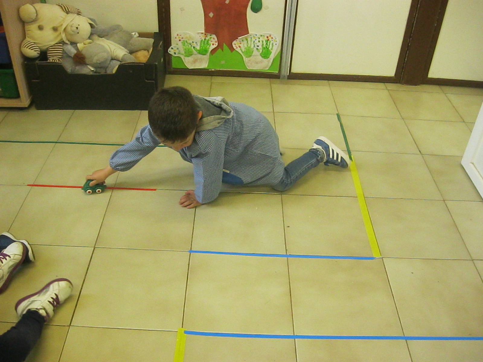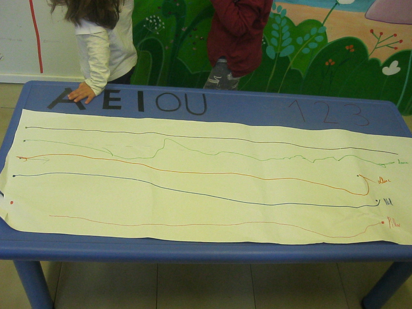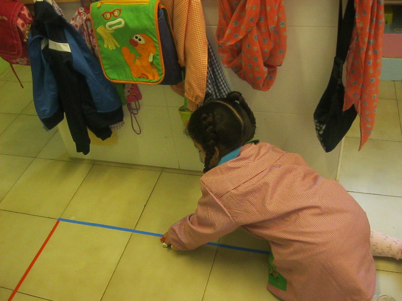 Treballem el traç horitzontal amb retolador i línees a l’espai de l’aula: