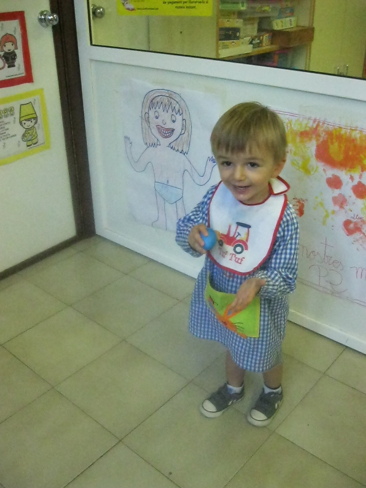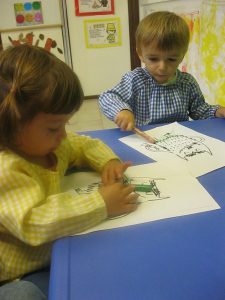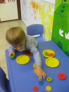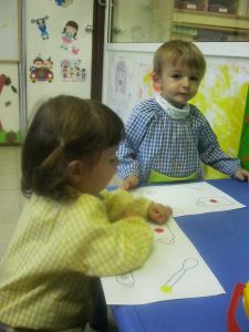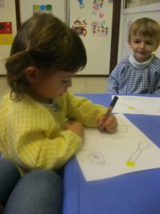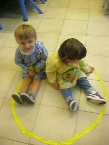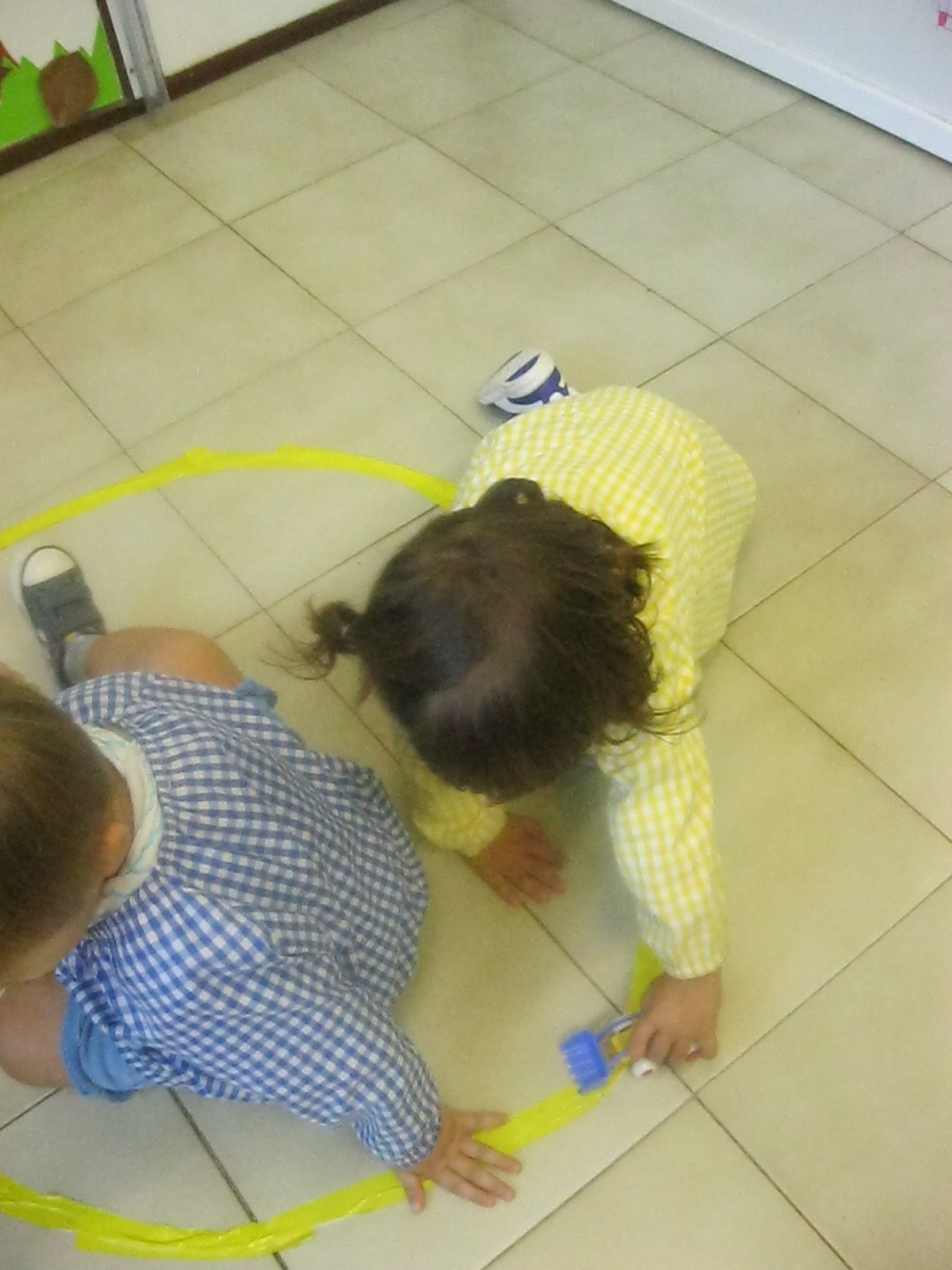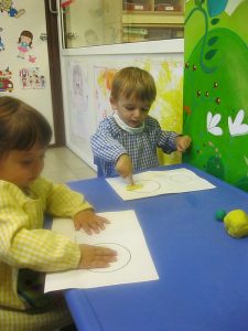 Al llenguatge matemàtic hem continuat treballant el cercle (rodona) i els conceptes petit i gran. Hem treballat amb plastilina, junt amb uns altres concepte com dins i fora i amb material i coses amb forma de rodona.