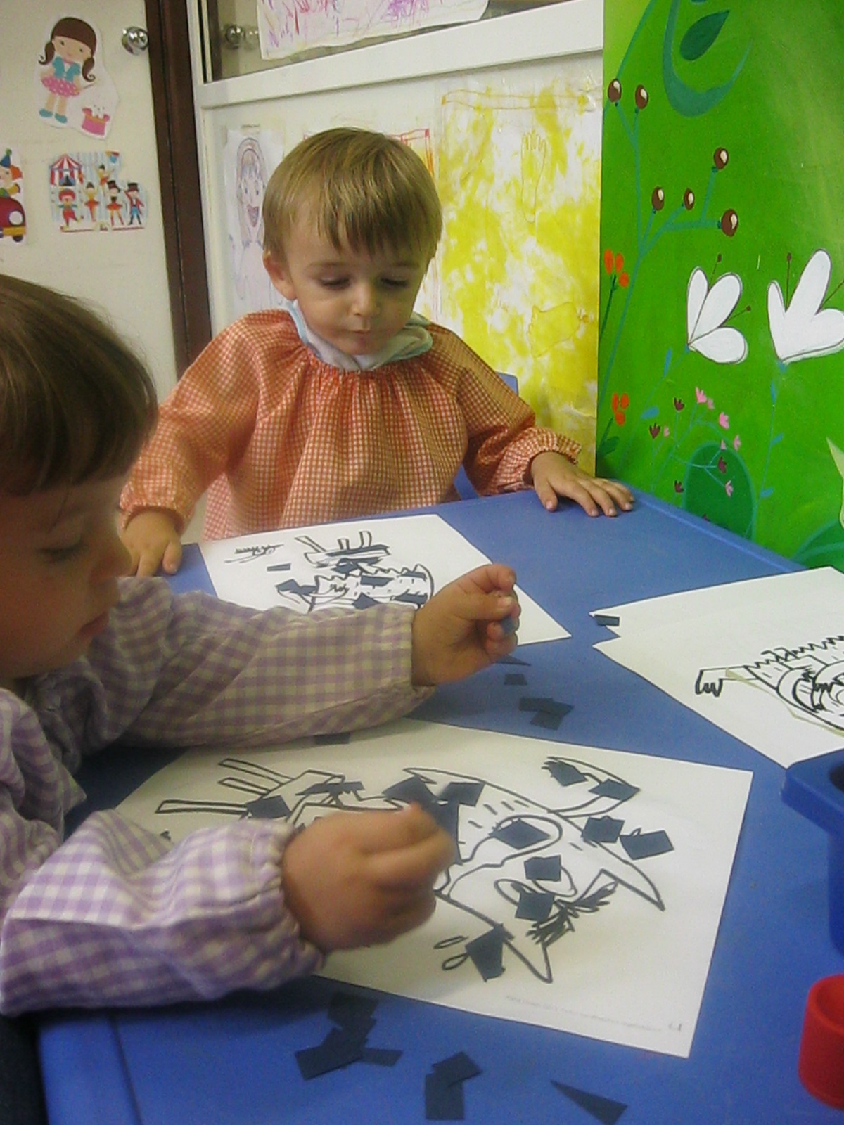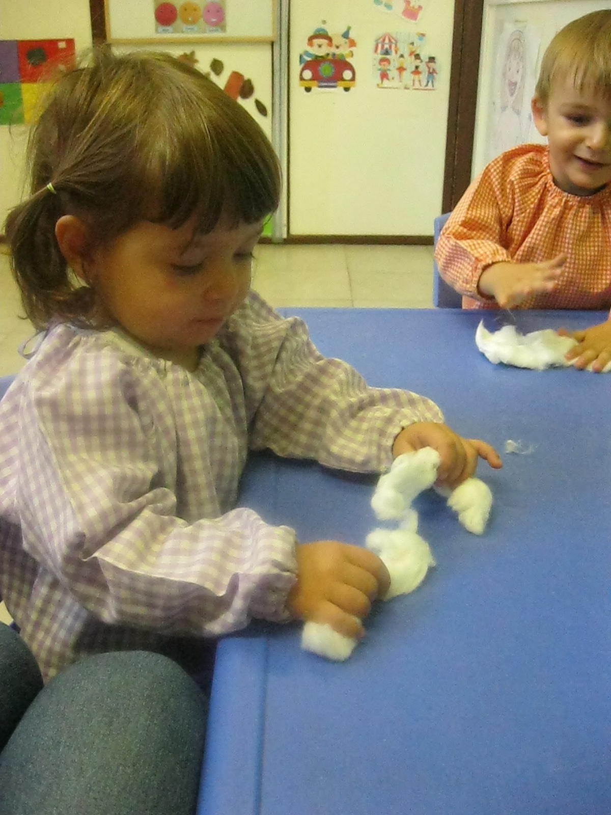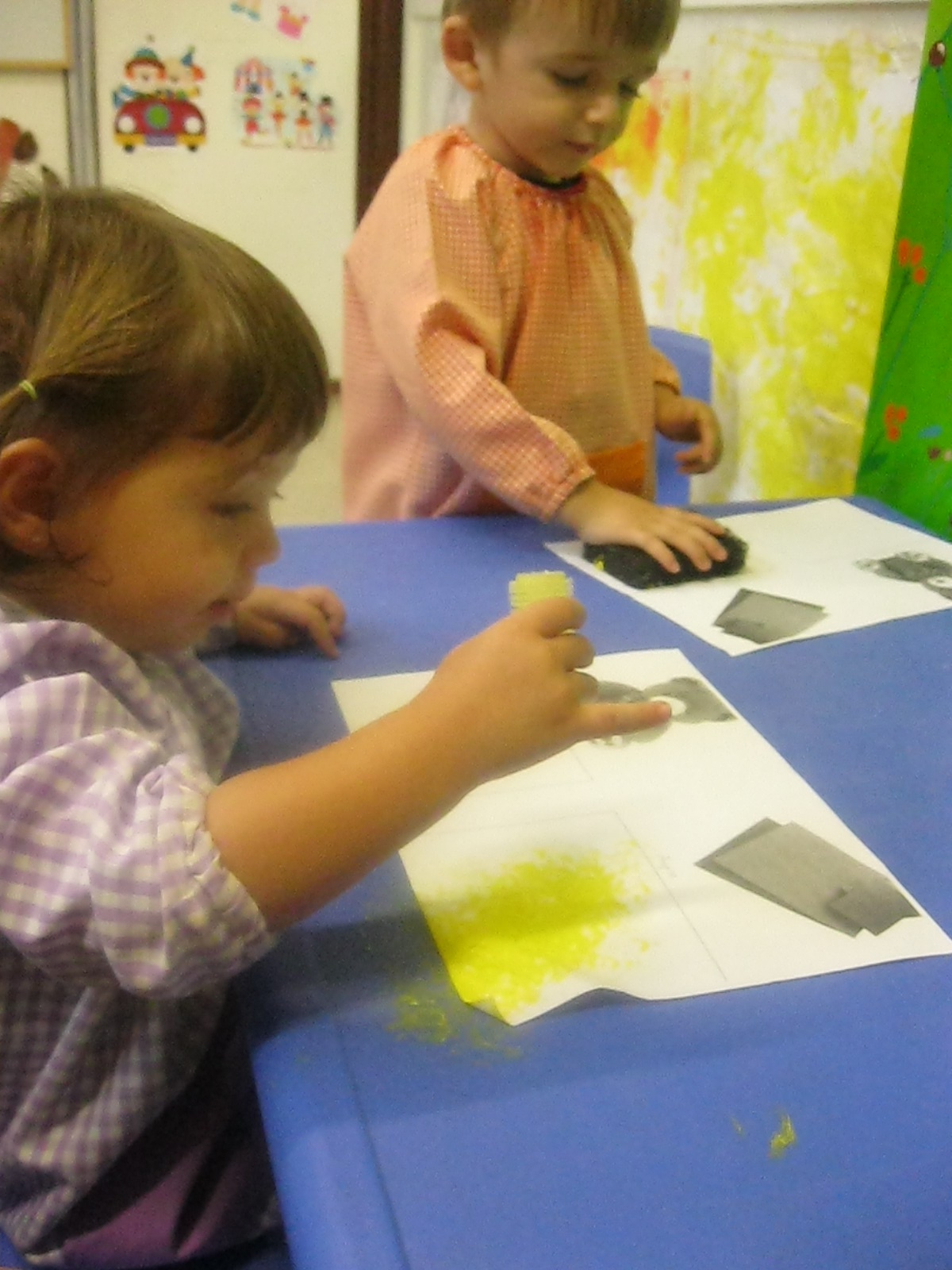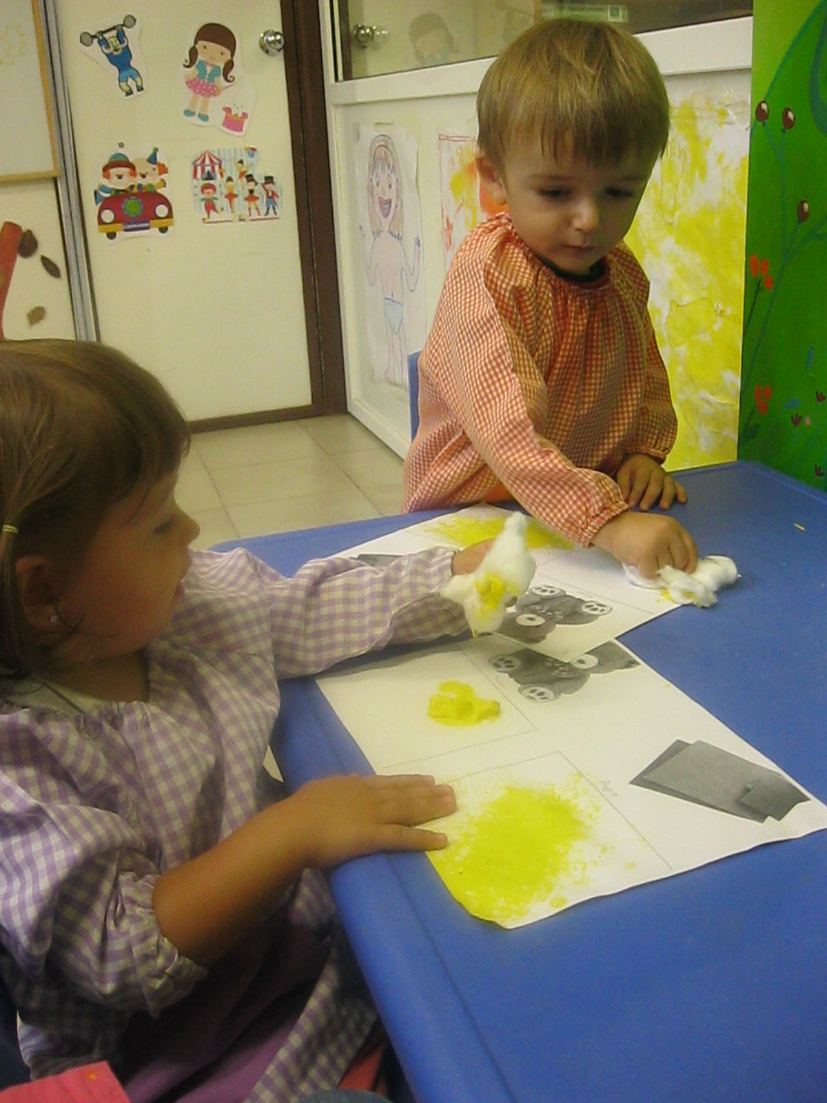 A l’hora de fer plàstica hem treballat amb diferents textures: suaus i aspres, i hem pintat amb elles. A més, hem fet traços lliurement en un mural per decorar la classe.