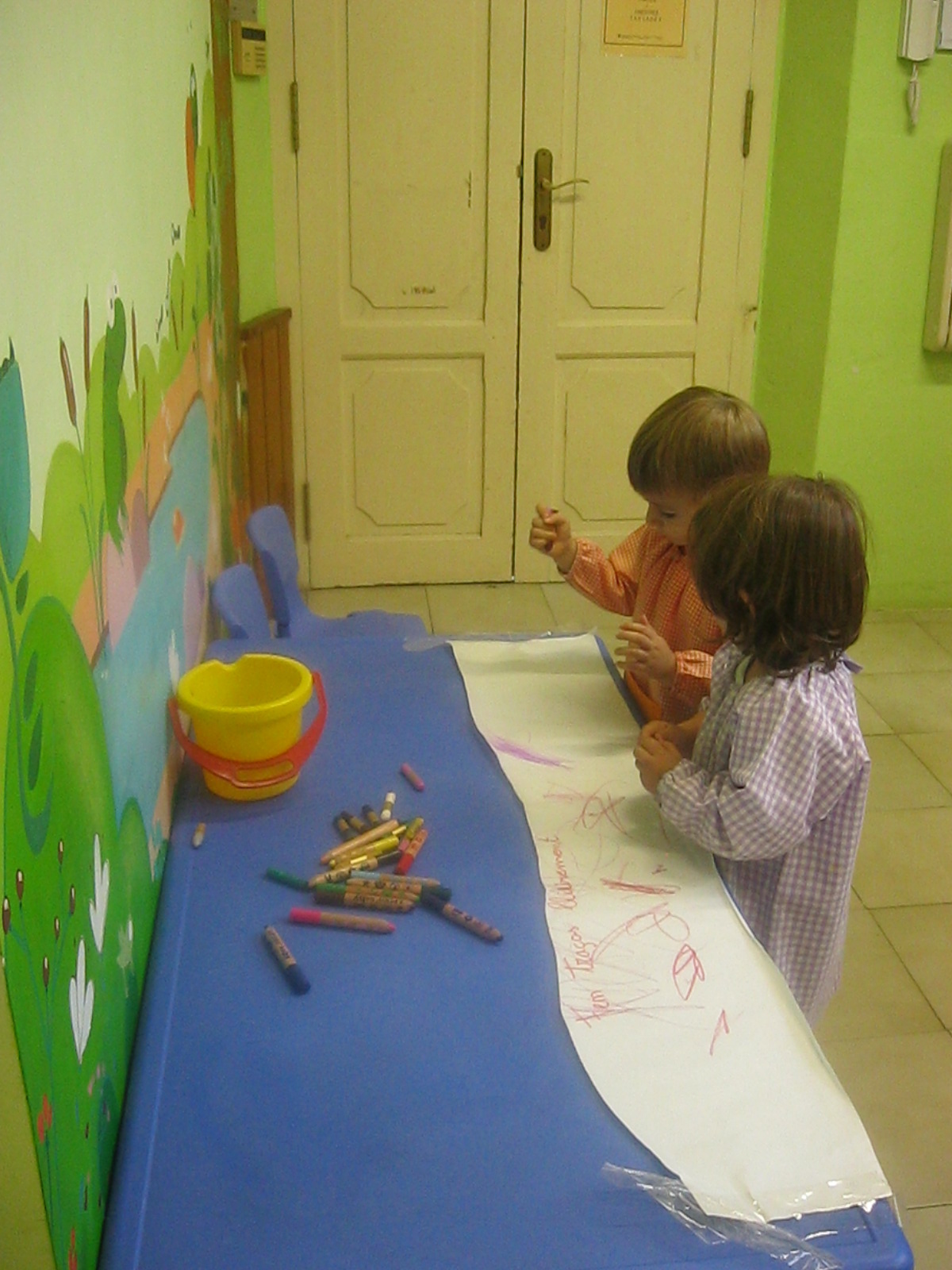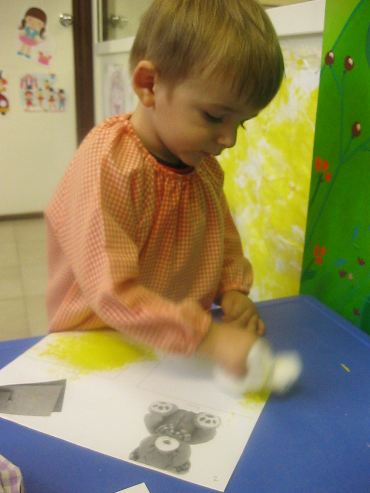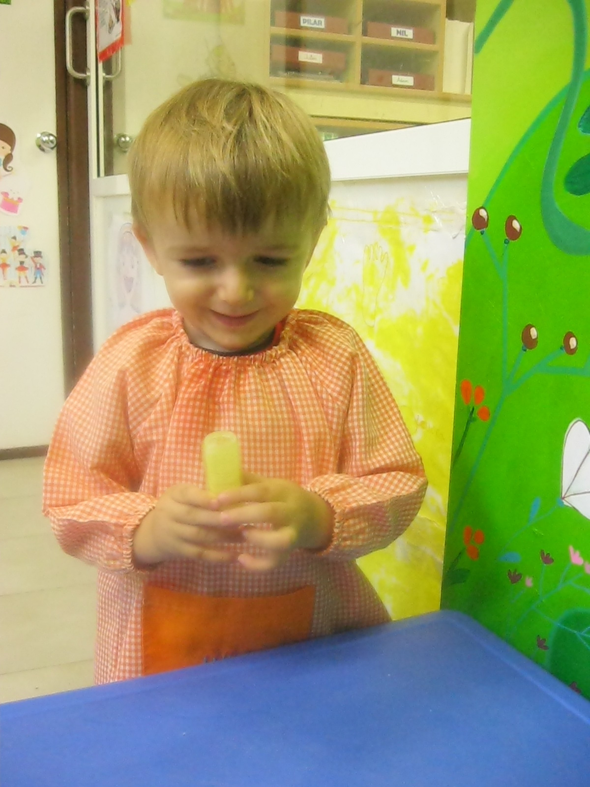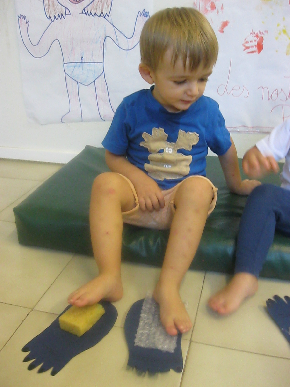A l’hora de fer plàstica hem treballat amb diferents textures: suaus i aspres, i hem pintat amb elles. A més, hem fet traços lliurement en un mural per decorar la classe.