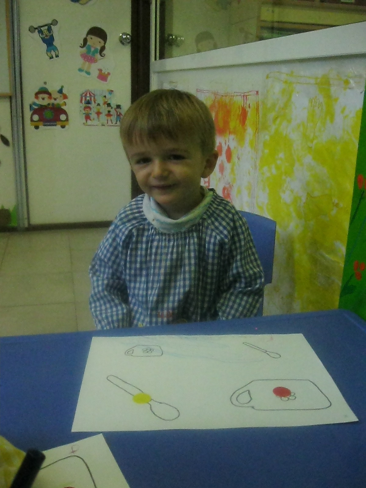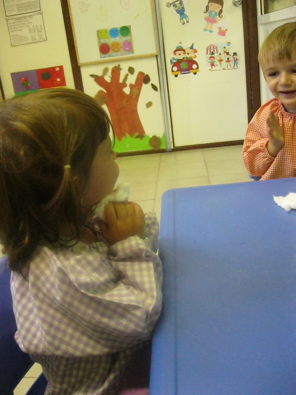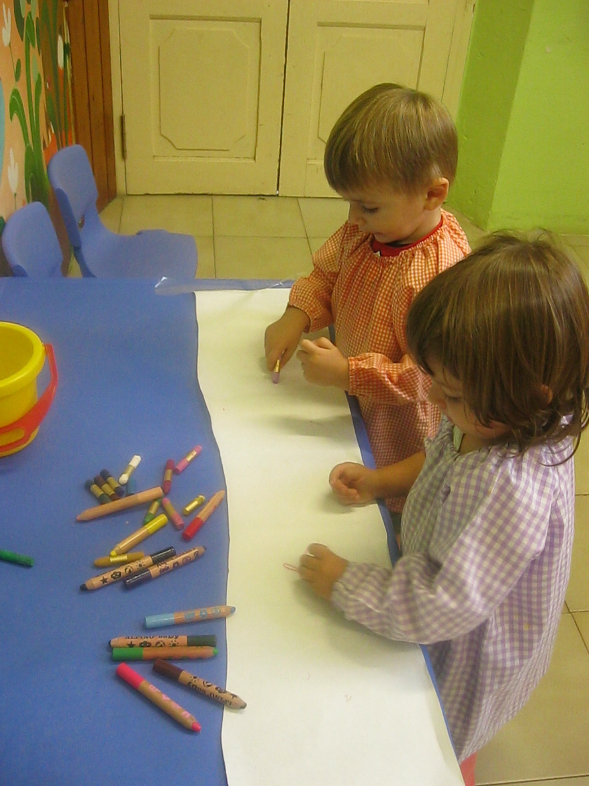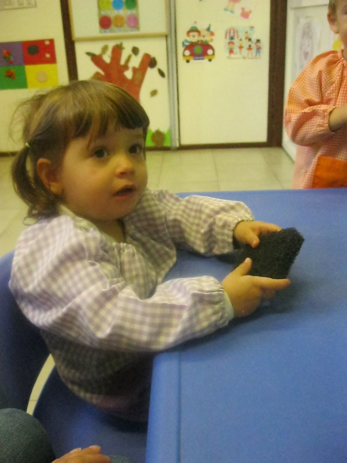 A l’hora de fer plàstica hem treballat amb diferents textures: suaus i aspres, i hem pintat amb elles. A més, hem fet traços lliurement en un mural per decorar la classe.