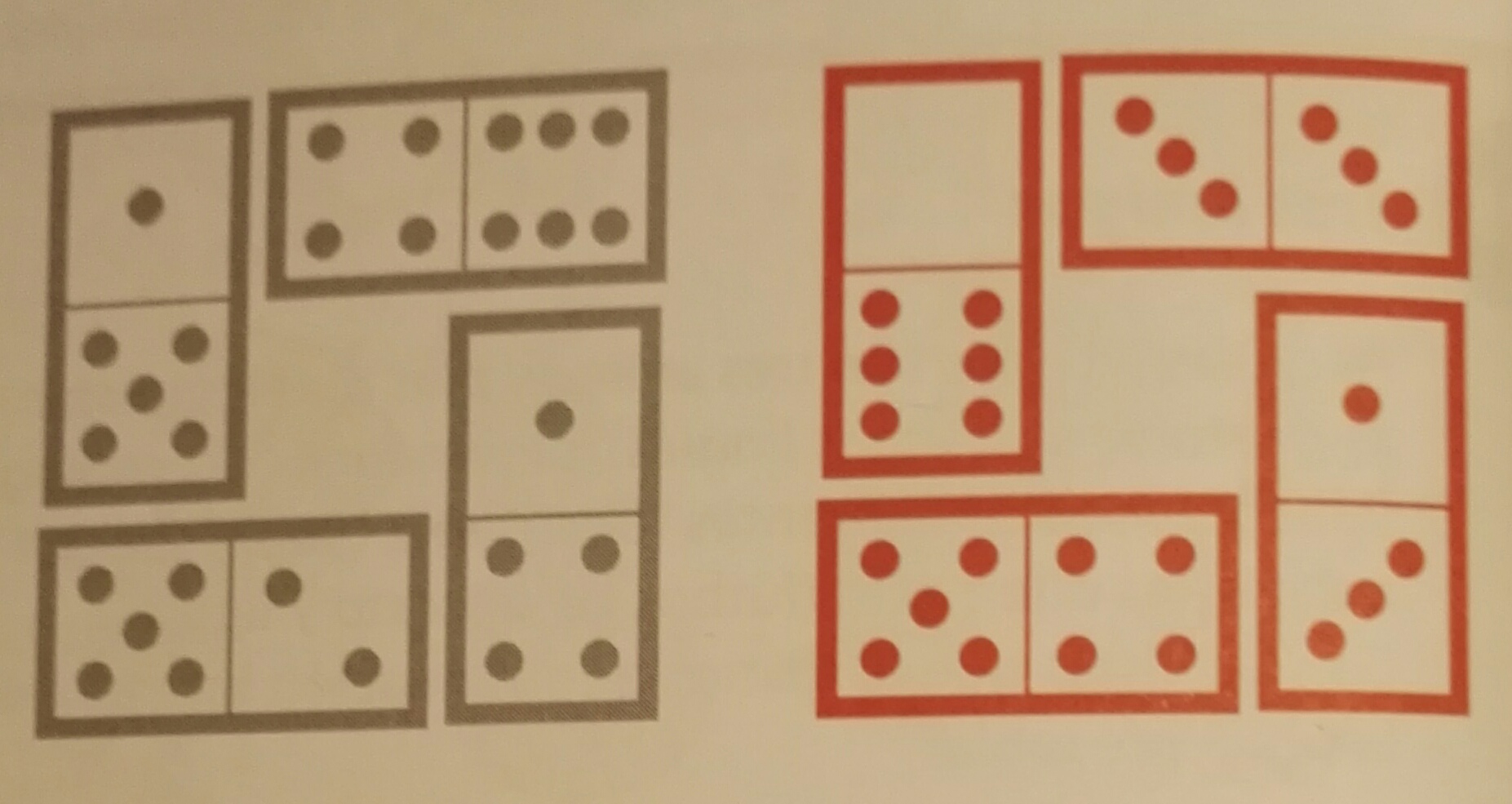 Les fitxes de dòmino de color gris les hem col·locat formant un quadrat, de manera que si contes els punts que hi ha a cada costat del quadrat tots sumen 11. Construeix tu un quadrat amb les fitxes de color vermell, de manera que els punts que hi ha a cada costat sumin 9.
