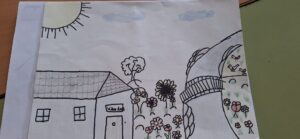 Dibuixos on representen com creien que era el paisatge on vivia la María.