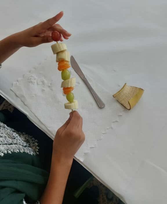 Després vam preparar un esmorzar molt saludable: broquetes de fruita amb plàtan, raïm i mandarina. Ens ho vam passar molt bé fent les broquetes i després menjant-les amb les famílies. Va ser un matí ple de creativitat, colors i alegria!