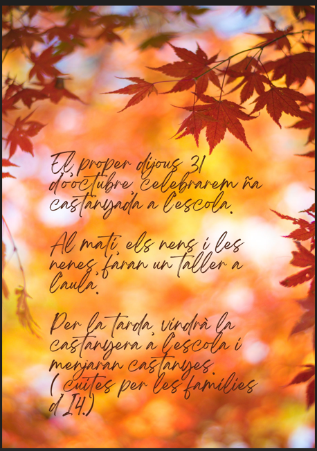 LA CASTANYADA AL TURONET Feu un comentari / Per admin / 31 d'octubre de 2024 / Portada Aquesta celebració es fa a porta tancada. Recordeu que el dilluns 4 de novembre l’escola estarà tancada, ja que és un festiu de lliure disposició.