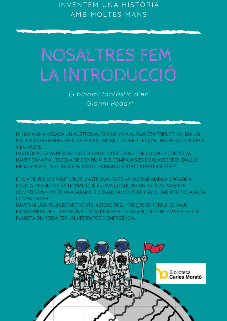 La tècnica de creativitat que hem utilitzat per escriure el relat és el binomi fantàstic (dues paraules d’universos conceptuals diferents, que quan es troben, de sobte en neix una història) que Gianni Rodari explica en la seva famosa obra Gramàtica de la fantasia, i el binomi que us ens ha tocat és ASTRONAUTA – MULTA.