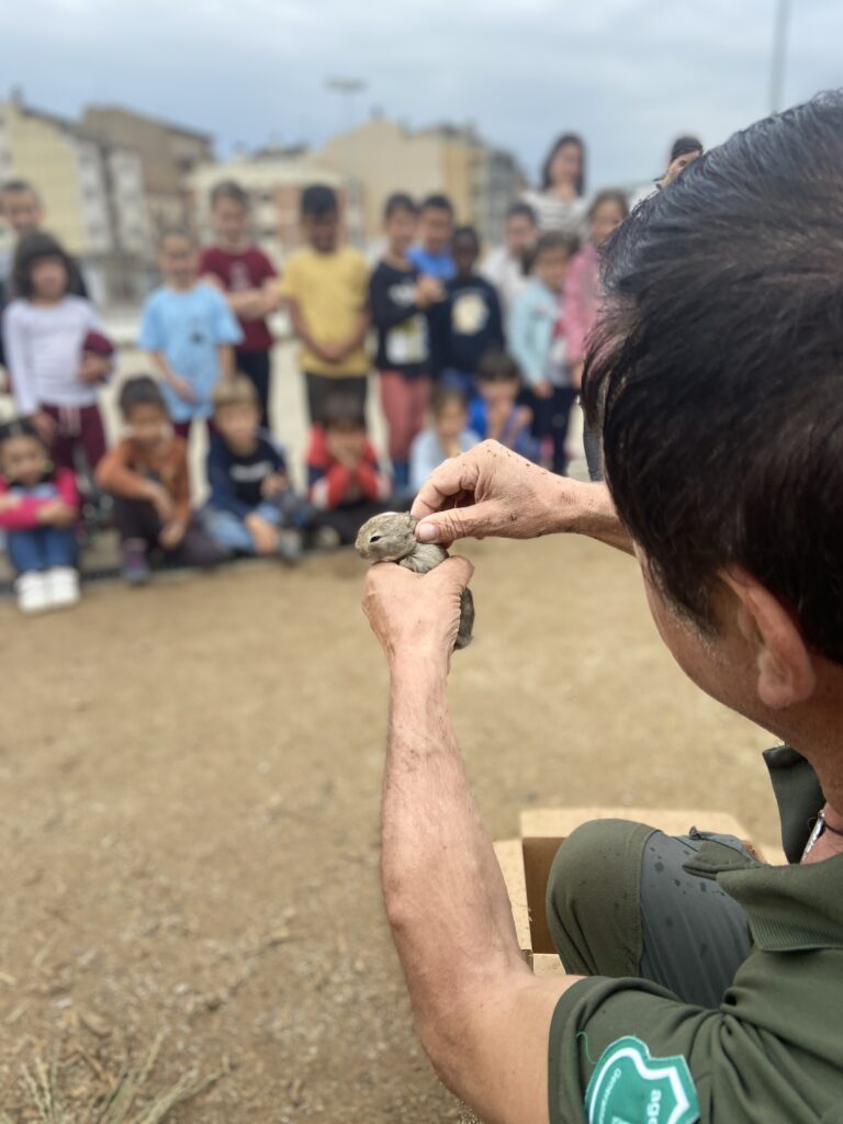 Els infants de mitjans, coincidint amb el dia en que compartien aula amb els infants de I5, han tingut l’oportunitat de presenciar aquest moment. Han compartit una estona amb l’agent rural que els ha pogut explicar com es desenvoluparia tot el procés d’acompanyament. Abans de que se’ls emportés els hem pogut acariciar i desitjar-los el millor.
