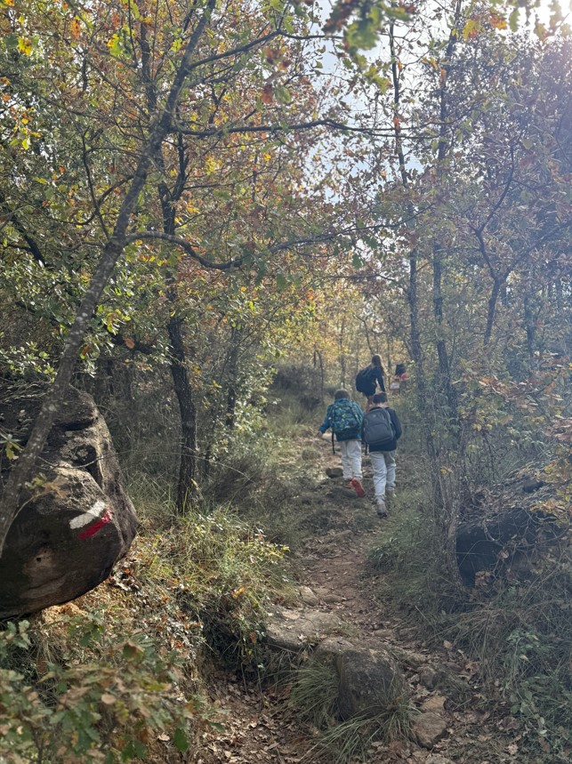 Des del trencant de Brics, vam seguir el GR 7, un camí ple d’encant que ens va portar per corriols, camps, rouredes i boscos caducifolis. Pel trajecte vam poder observar com els colors de la tardor tenyien el paisatge de tons vermellosos, ocres i daurats. També vam sentir l’olor de bosc humit, vam escoltar els ocells i vam descobrir petits detalls de la natura que sovint passen desapercebuts.