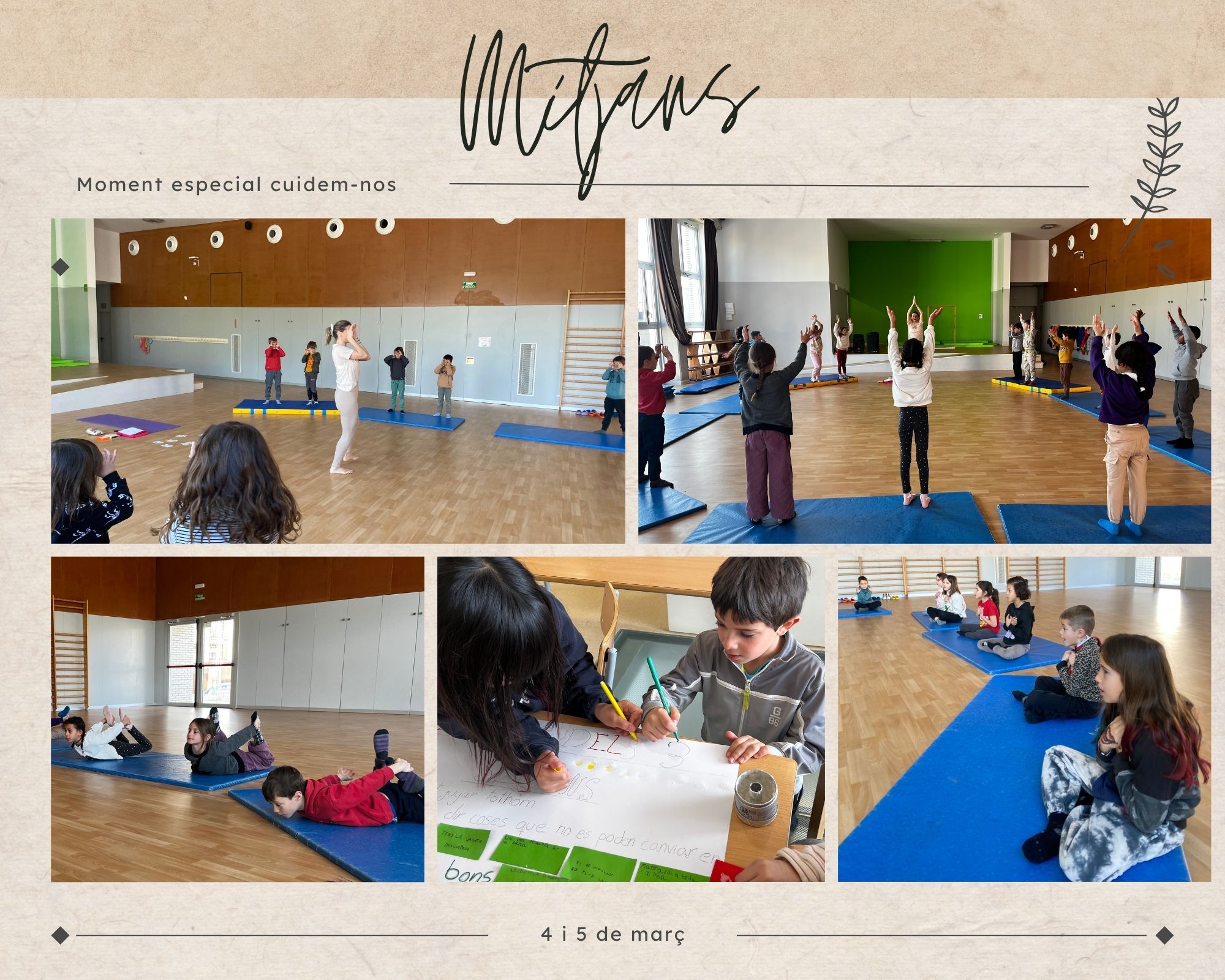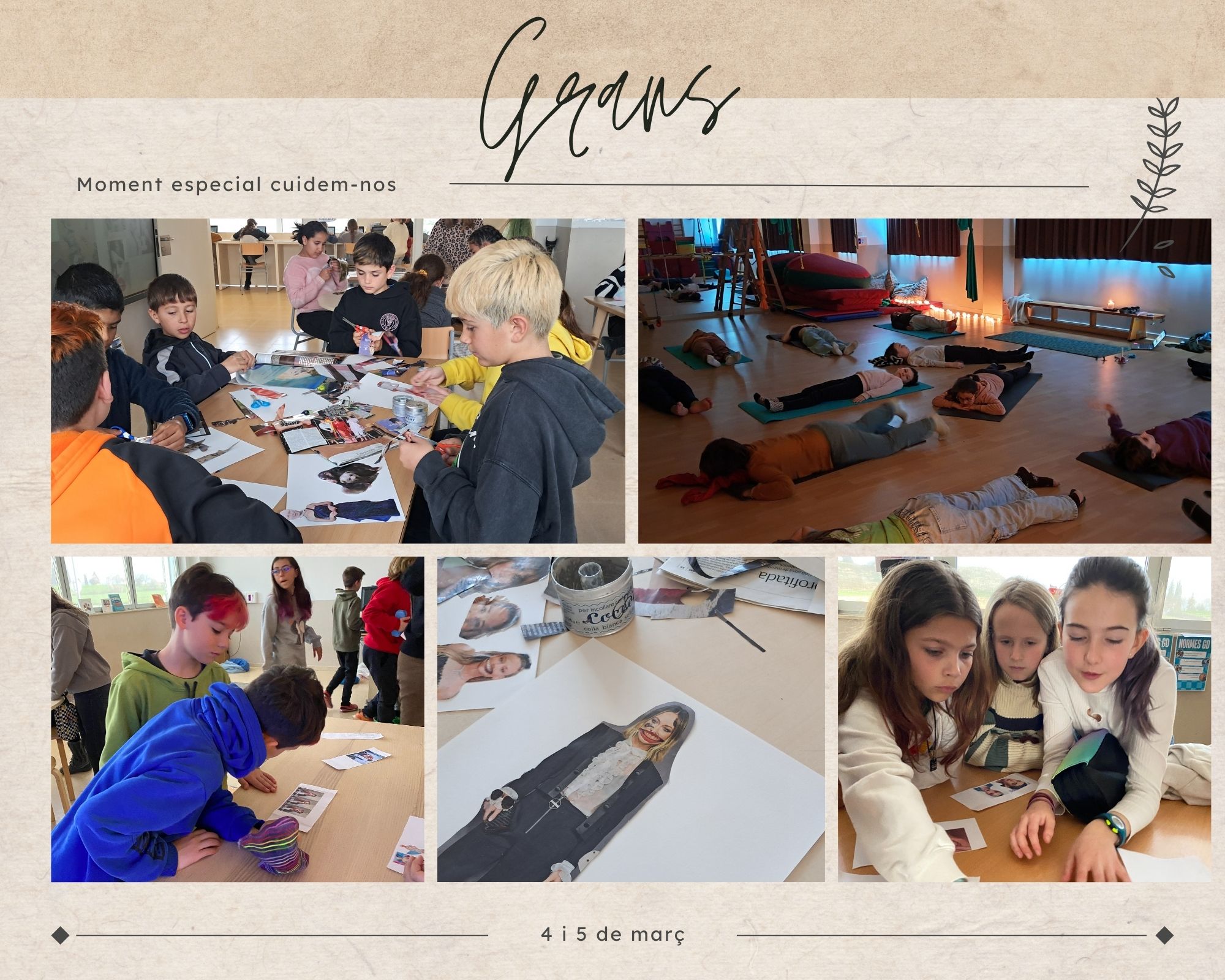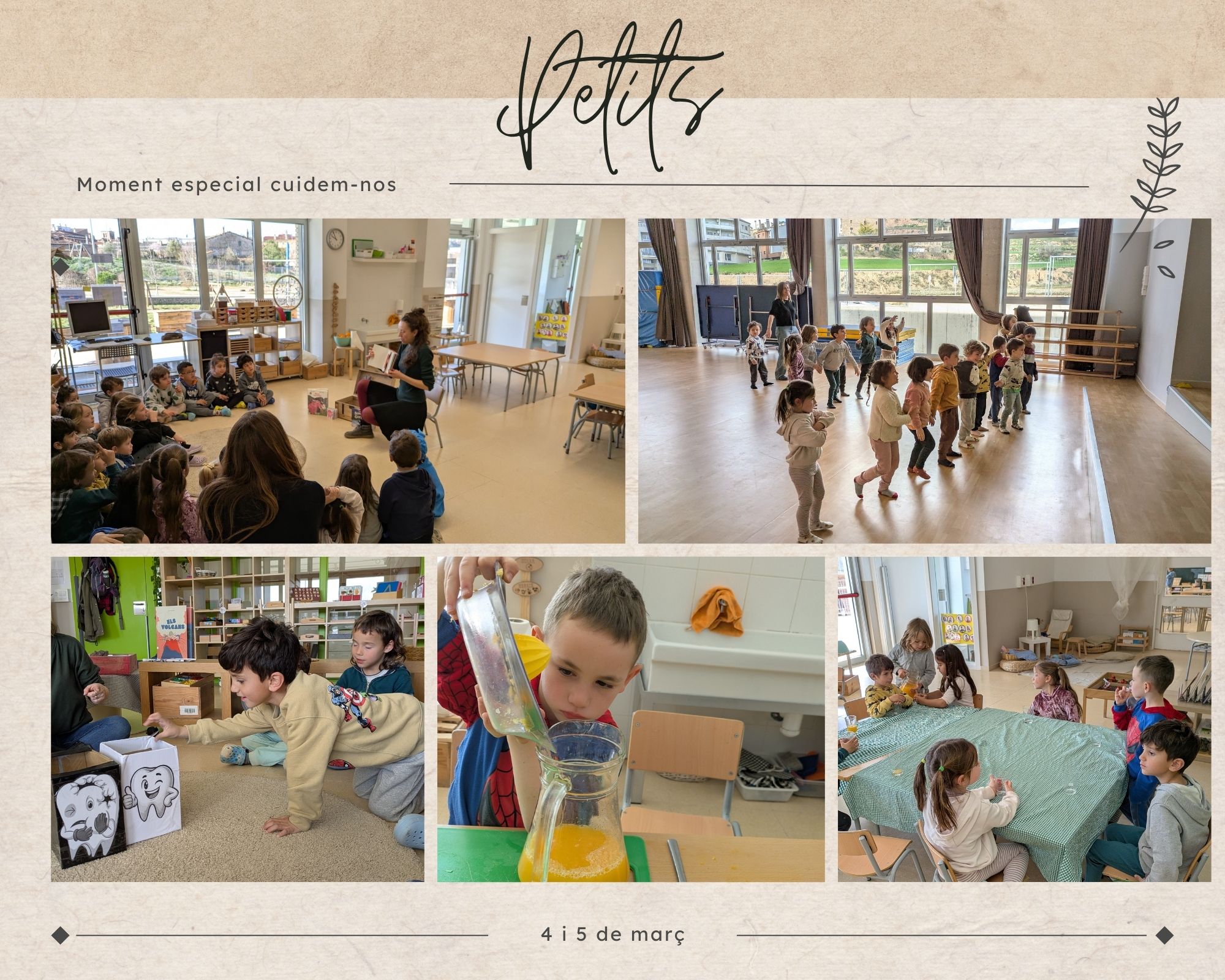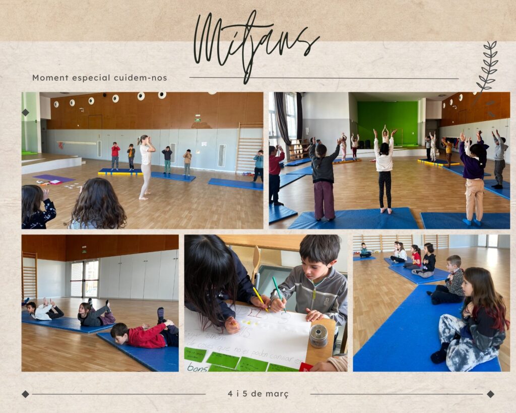 Els passats 4 i 5 de març, els infants de petits van participar en diversos tallers d’autocura per celebrar el moment especial cuidem-nos. A través de propostes com massatges, música i dansa, joc lliure i un tast de suc de taronja, van explorar els 4 pilars d’autocura. També van gaudir d’un taller de contes, dinamitzat per la Violeta, que va obrir un espai de reflexió sobre els rols de gènere i, finalment, van rebre la visita d’una higienista bucodental, que els va ensenyar, mitjançant un taller pràctic, com tenir cura de la salut de la boca i les dents.
