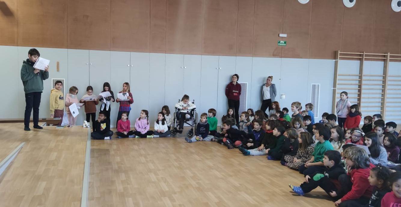 Aspirants de tercer, quart, cinquè i sisè curs de primària han llegit un fragment dels llibres Els Pòstits del senyor Nohisoc de Tina Vallès i Skeleton Keys de Guy Bass, davant dels companys i companyes de la comunitat.