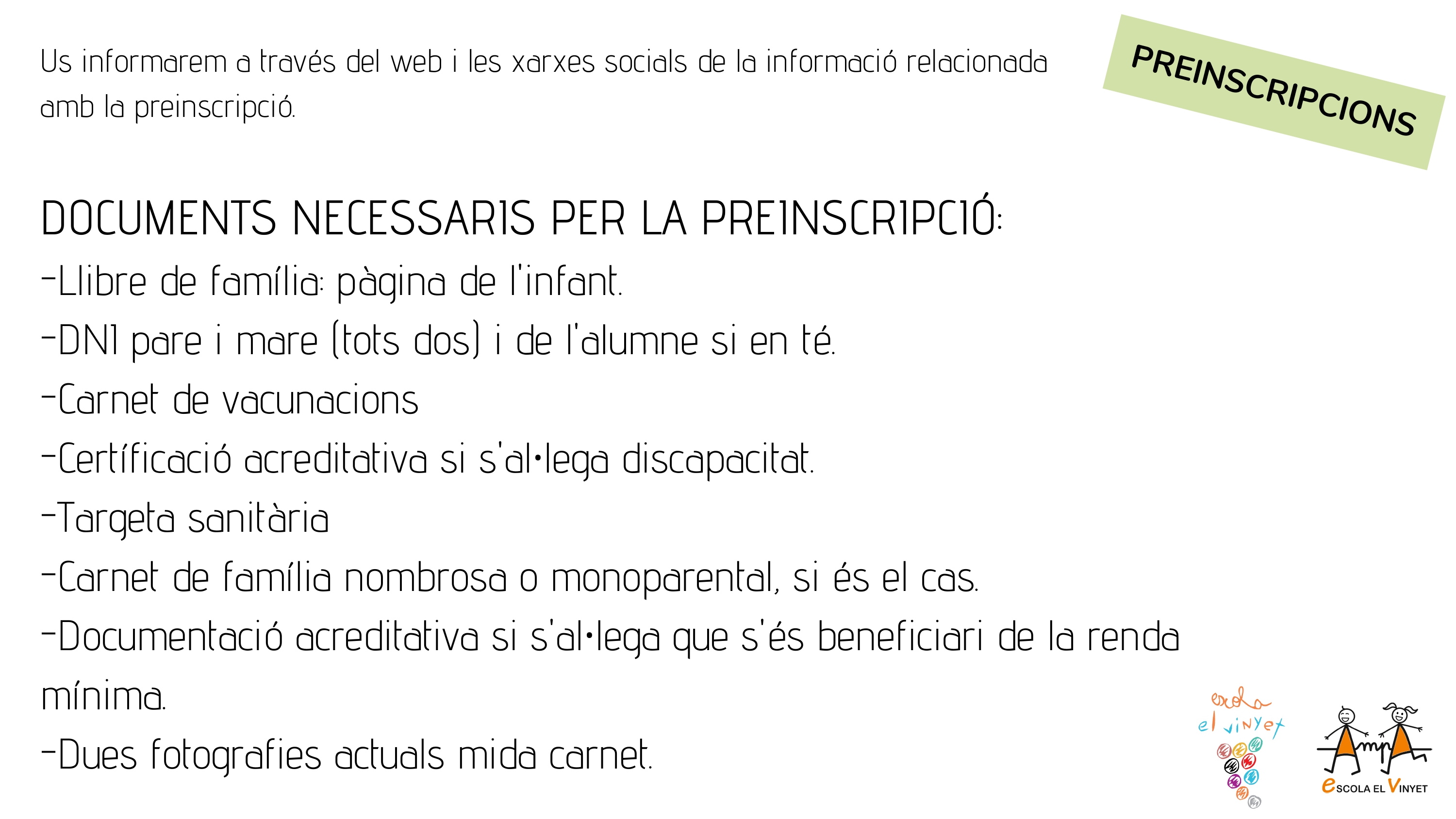 Al web de l’escola anirem penjant tota aquella informació comunicada pel Departament d’Educació amb relació a la preinscripció.