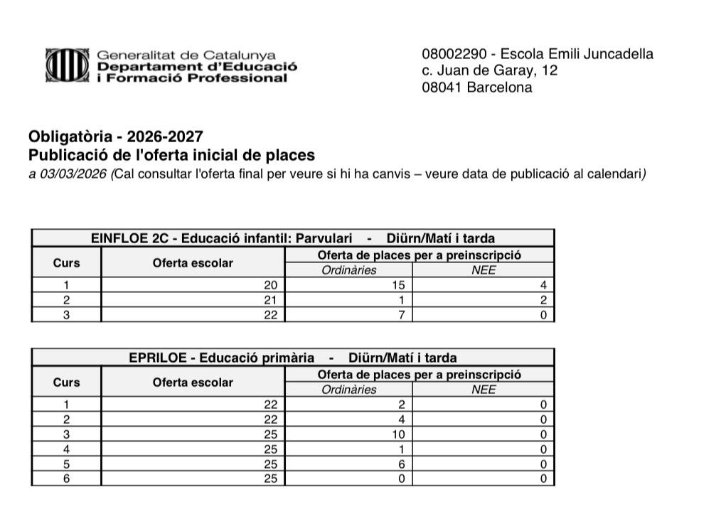 Publiquem l’oferta inicial de places del curs 2026-2027.