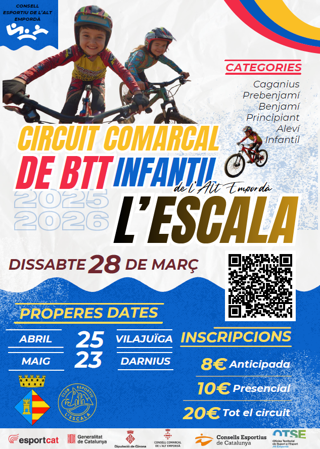 El proper dissabte 28 de març, L’Escala acollirà una de les jornades del Circuit Comarcal de BTT Infantil de l’Alt Empordà, una iniciativa organitzada pel Consell Esportiu de l’Alt Empordà i el Club Esportiu L’Escala que promou la pràctica del ciclisme de muntanya entre els infants de la comarca. La jornada està oberta a diferents categories