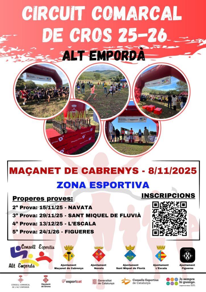 Des del Consell Esportiu de l’Alt Empordà ens fan arribar informació sobre les Proves del Circuit Comarcal de Cros 2025-2026, que començarà aquest pròxim dissabte 8 de novembre de 2025 a la Zona Esportiva de Maçanet de Cabrenys. És una gran oportunitat perquè infants, joves i famílies gaudeixin d’una jornada esportiva, saludable i plena de companyia!