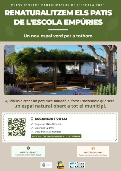 A l’Escola Empúries estem il·lusionats amb un projecte que neix del treball conjunt de mestres, alumnes, AMPA i entitats del municipi: la renaturalització del pati. Hem presentat aquesta iniciativa als Pressupostos Participatius amb l’objectiu de transformar aquest espai en un entorn més saludable, sostenible i obert a tota la comunitat. Per fer realitat aquest somni,